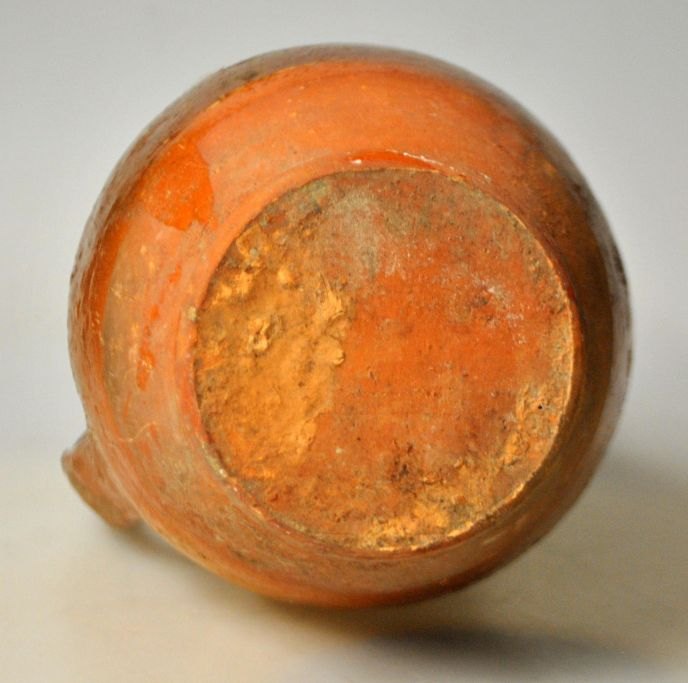 Antique Danish clay jug, 19th century. Red clay with brown and white glazes. H.: 19 cm.