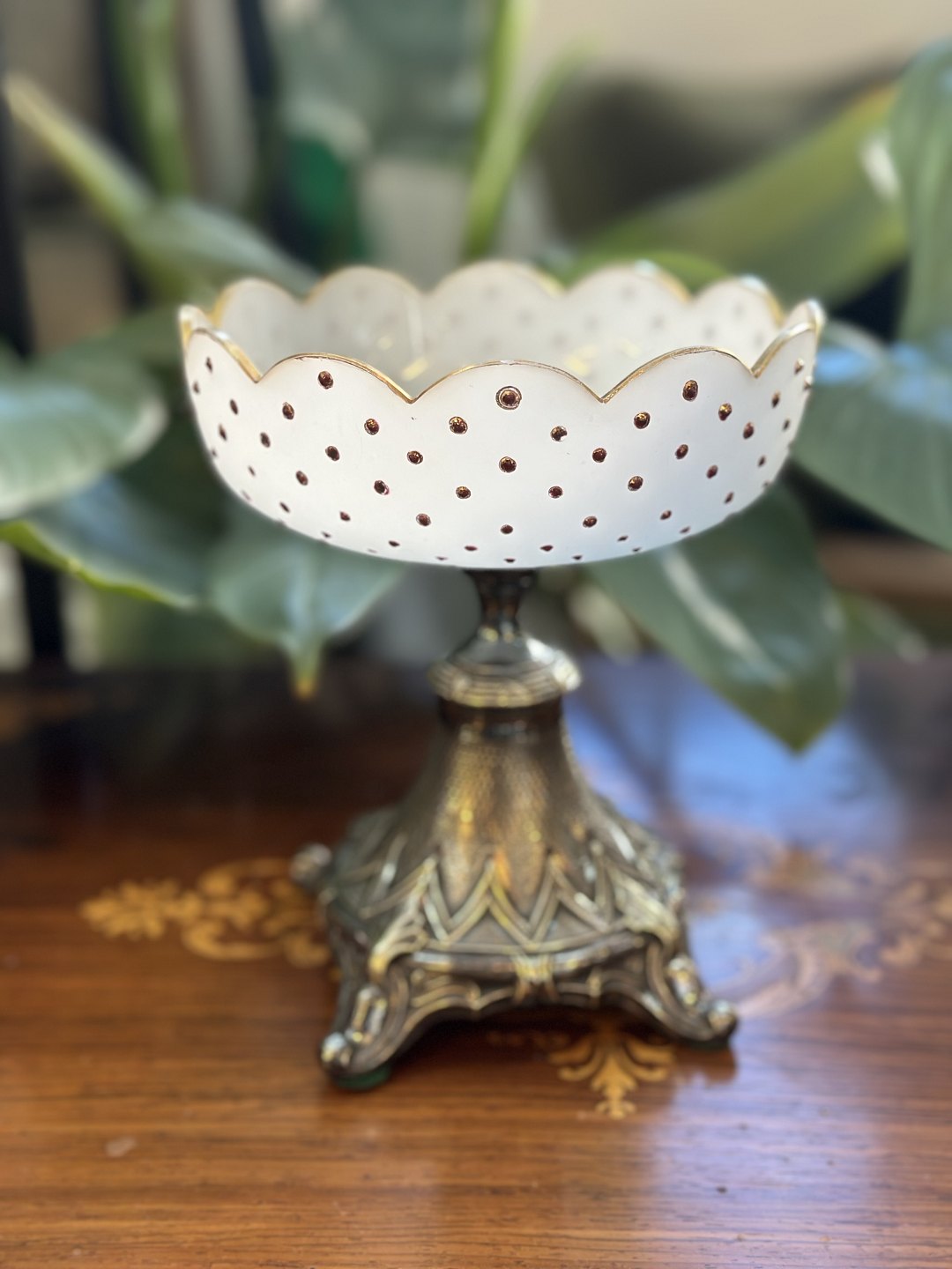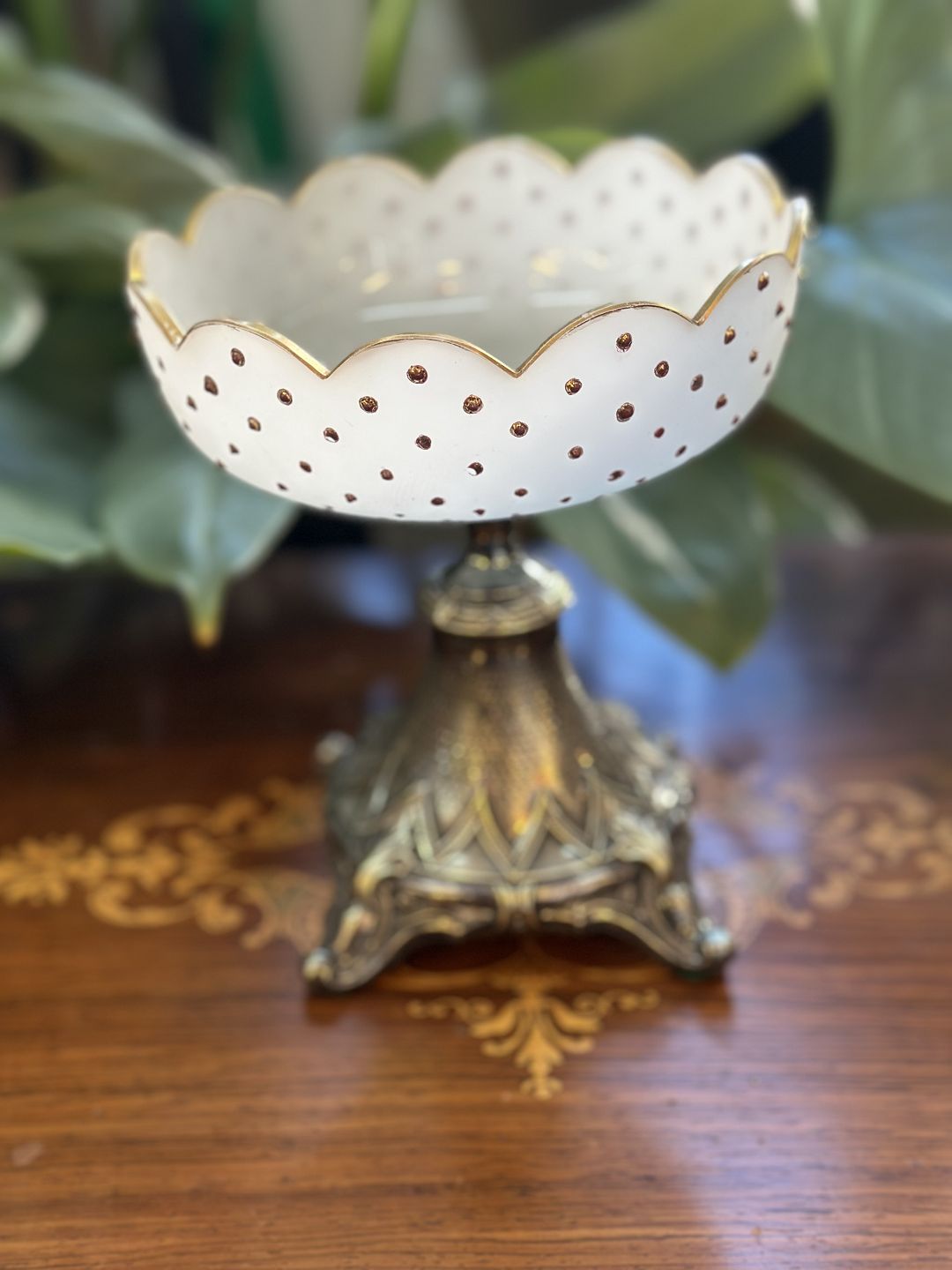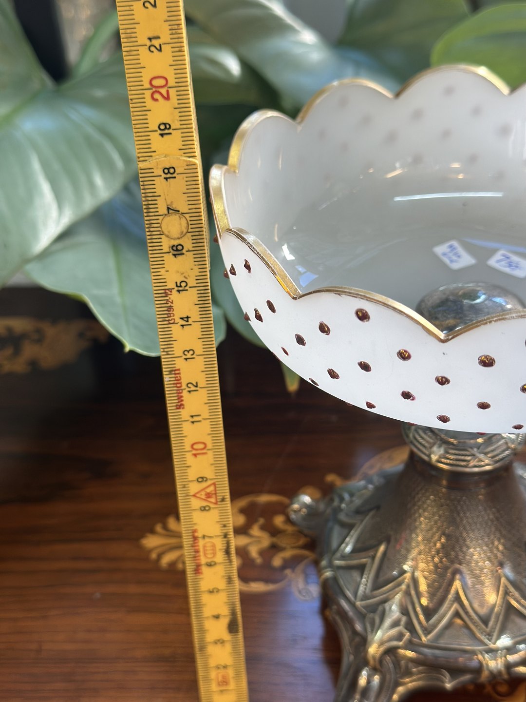 Vintage skål fra 1800 -1900 tallet , skålen er i opalin -glas (mælkehvidt glas ) med håndmalede gyldne prikker og guldkant , foden er i pletsølv med dekorative art nouveau - barokinspirerede detaljer , designet opaline glass fra slut 1800 -tallet