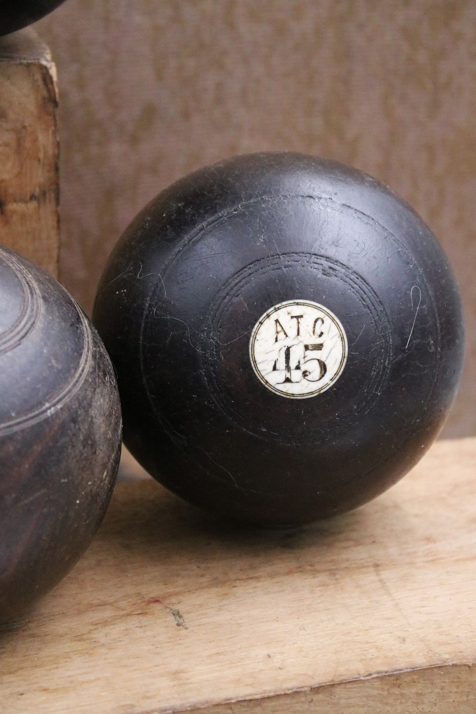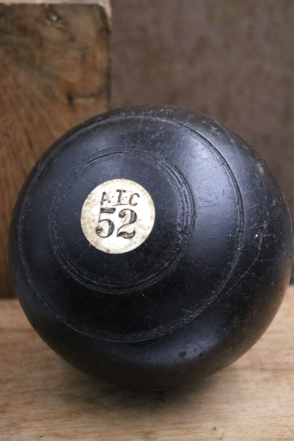 Dekorativ , antik bowling kugle i træ med nummer indlagt i horn.