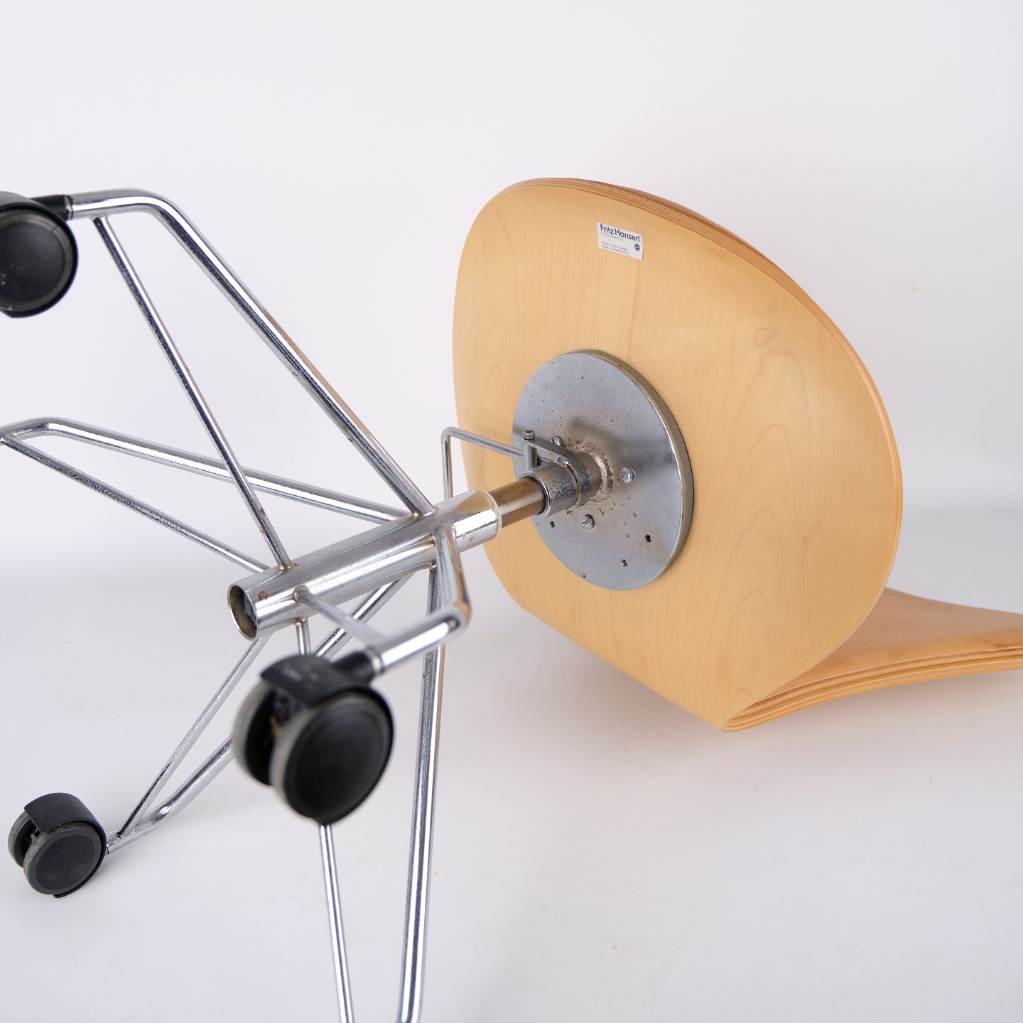 Arne Jacobsen Syver kontorstol, model 3117, for Fritz Hansen. Patineret naturlæder og kromstel med hjul. Klassisk dansk design.