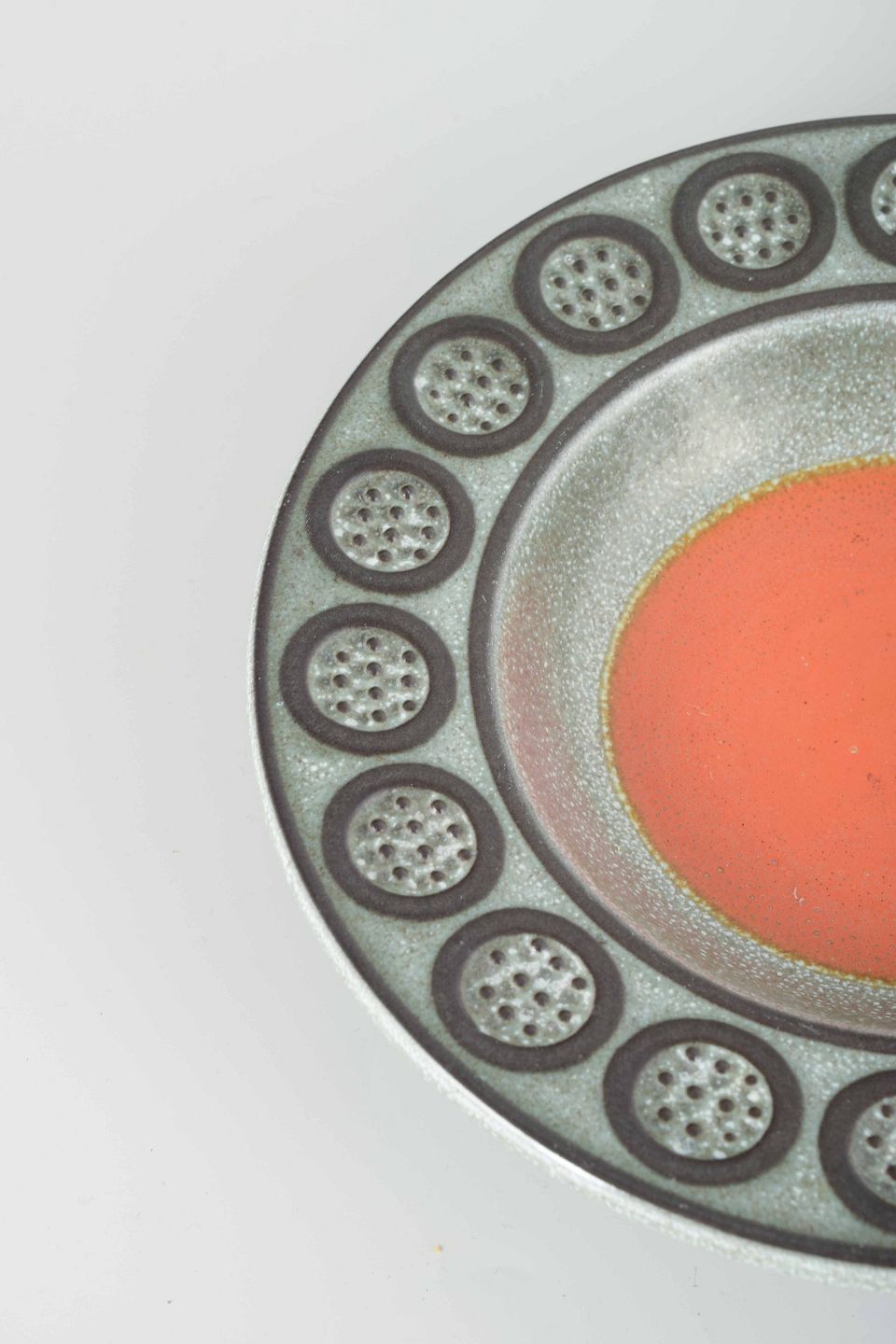 Decorative stoneware bowl with orange glazed center, surrounded by silver-grey and dark brown bands featuring circular relief motifs along the rim.