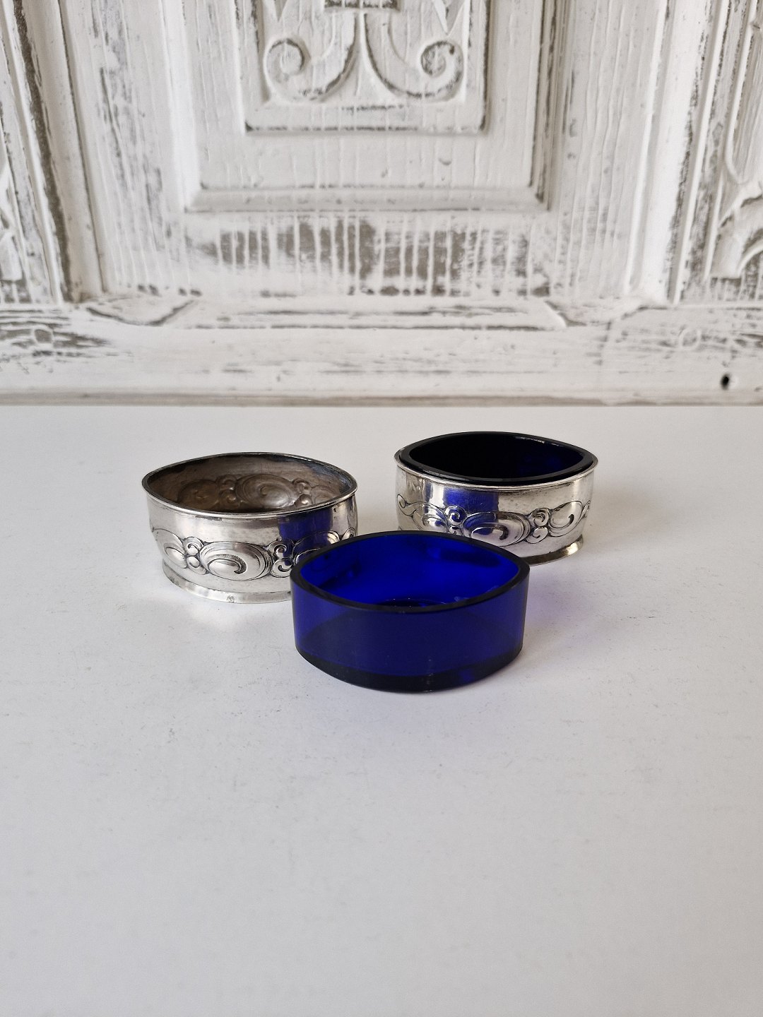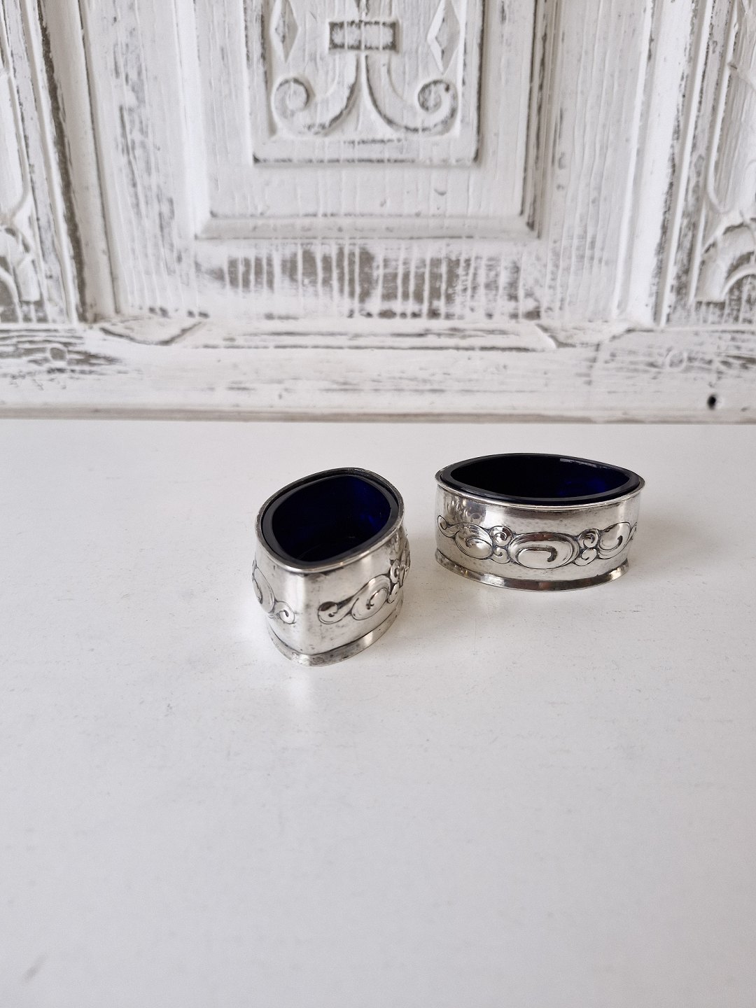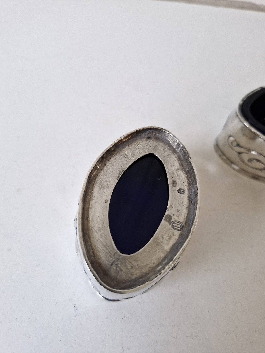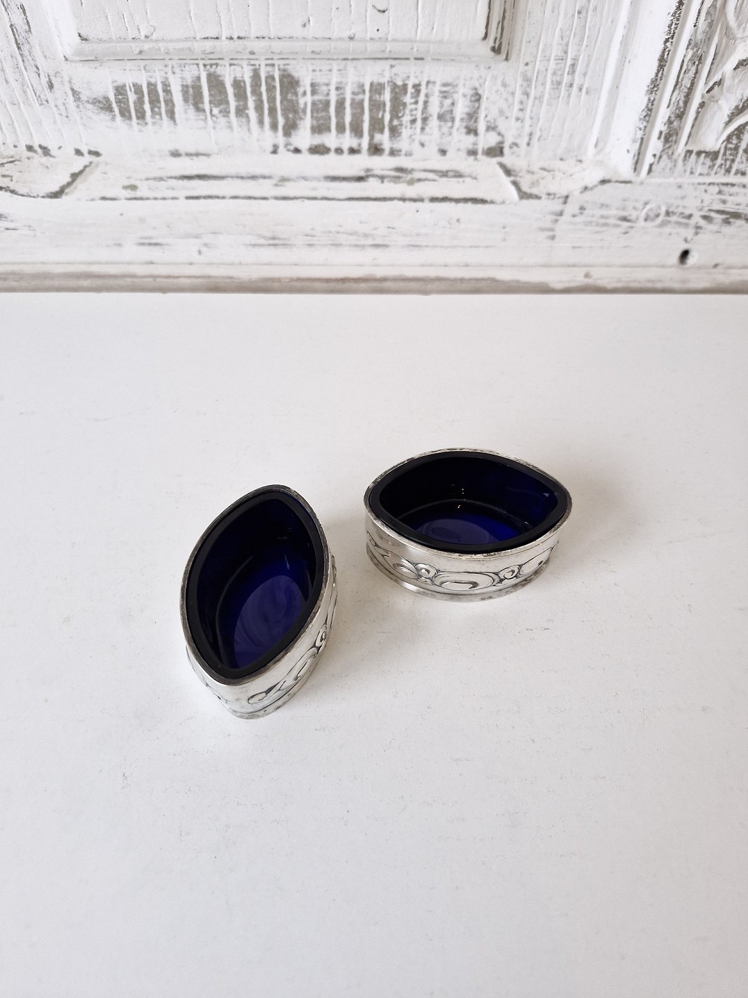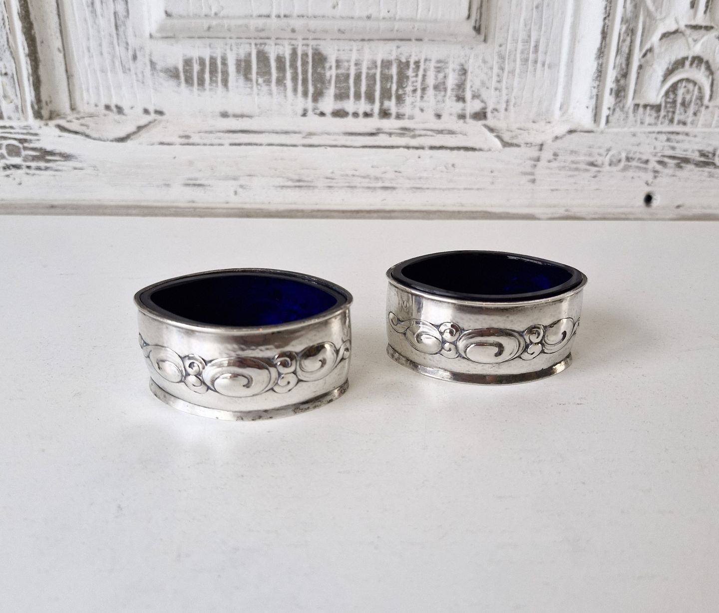 Par ovale saltkar i sølv med dekoration i skønvirkestil med indsatser i blåt glas.