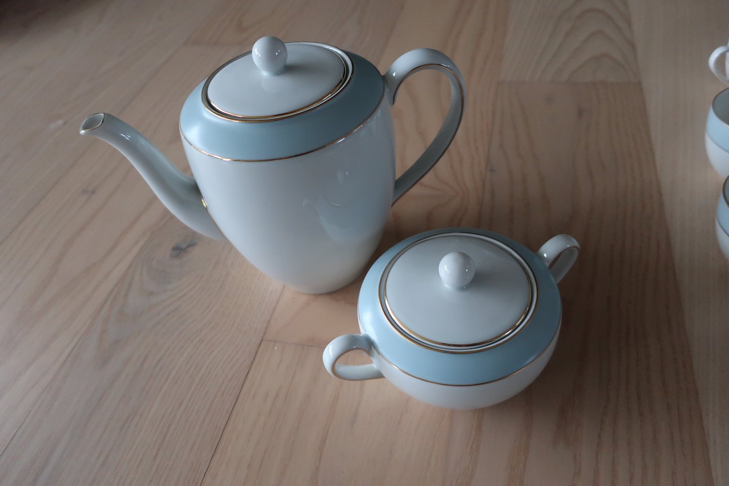 Et dejlig lyst og let stel: Hvidt med bred lys blå kant samt 2 guldstriber
