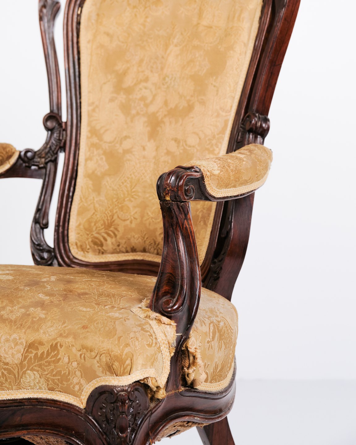 Antique armchair made of mahogany with carved details in the Rococo style, dated to around the 1890s. The seat and back are upholstered with floral upholstery.