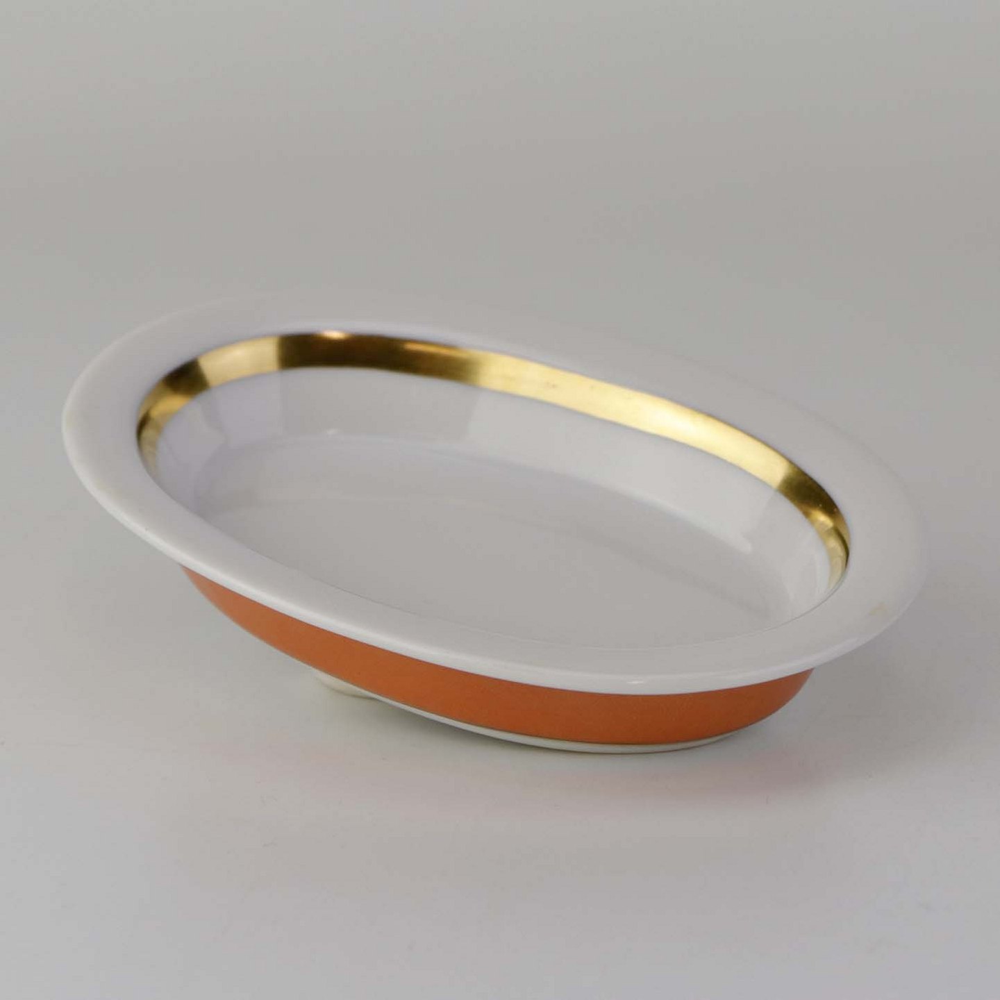 Service i glat hvidt porcelæn med orangerød dekoration over glasuren og guldkant