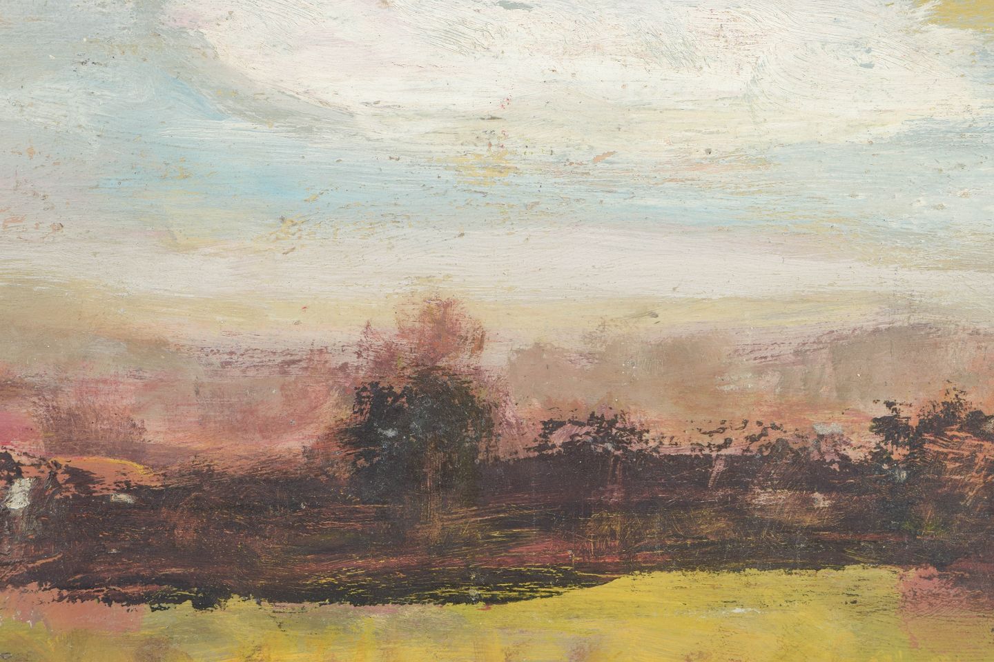 Stemningsfuldt impressionistisk landskab med bred horisontlinje under en lys, næsten opløst himmel. De varme jordfarver i forgrunden møder et diset rosa-brunt bælte af træer og buskads, udført med bløde, atmosfæriske penselstrøg. Et poetisk og stille naturmotiv, hvor lys og tone danner billedets egentlige centrum.