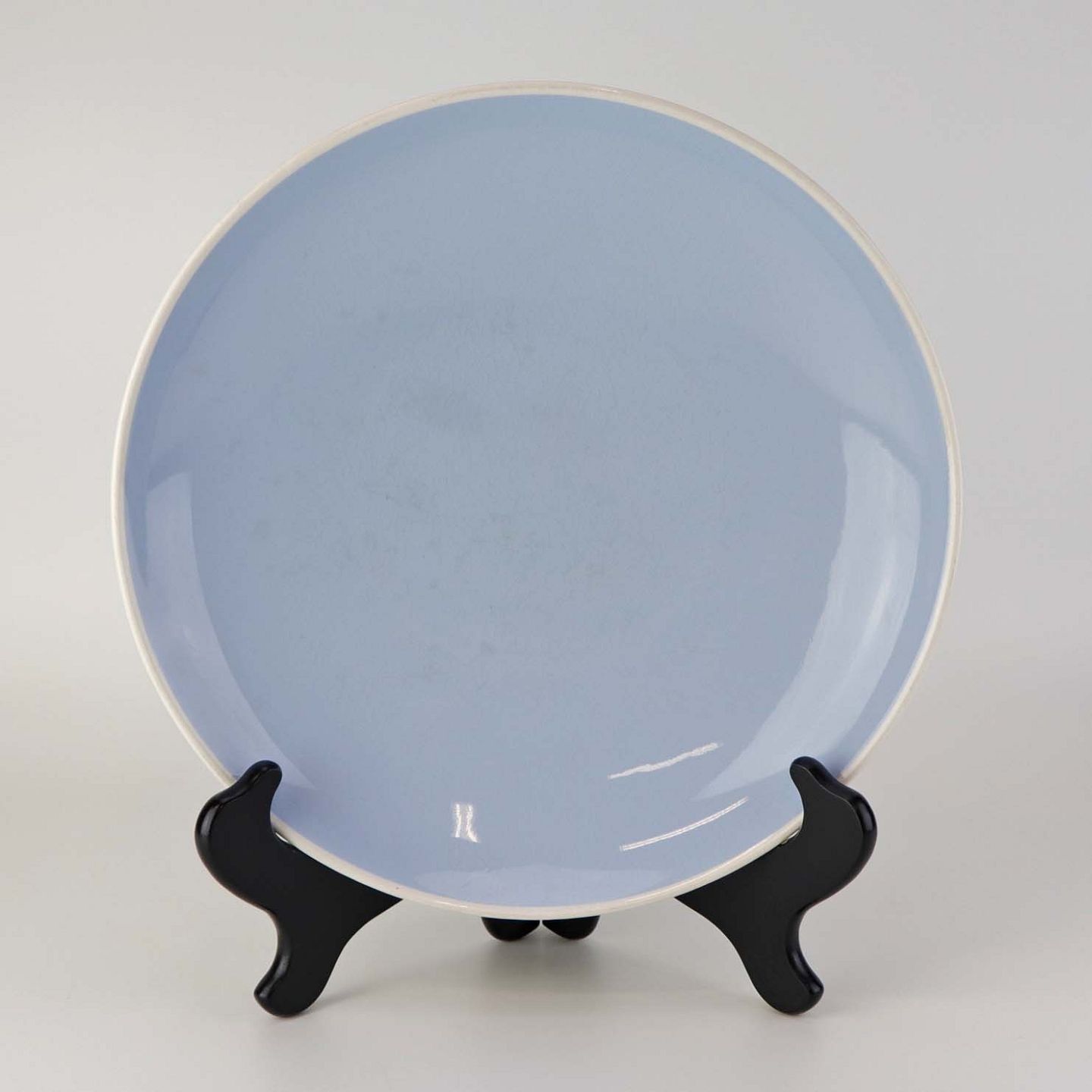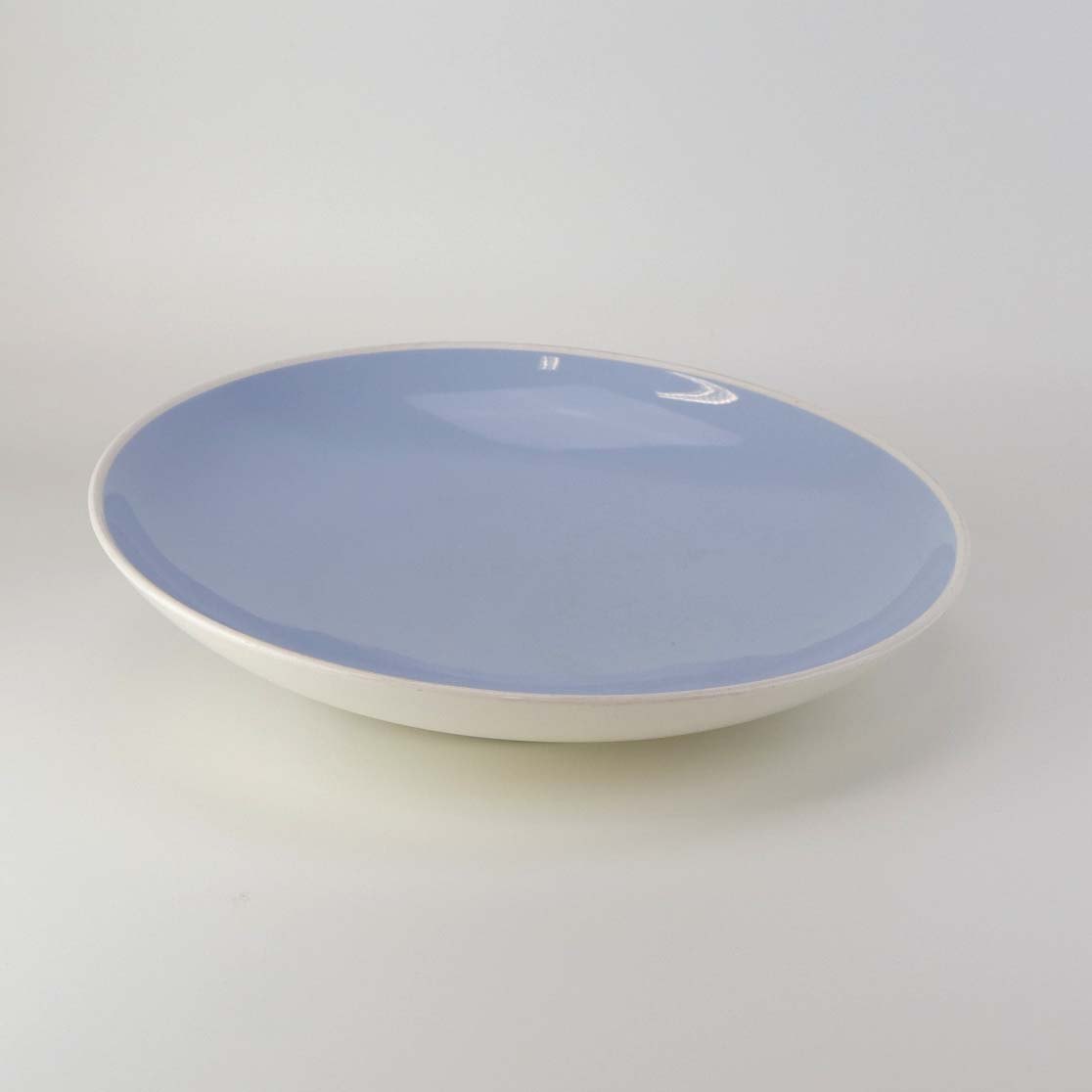 Service i lyseblå fajance dekoreret med tynd hvid kant.