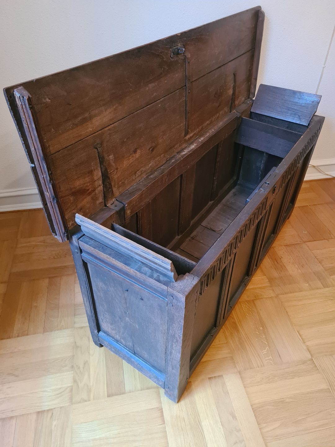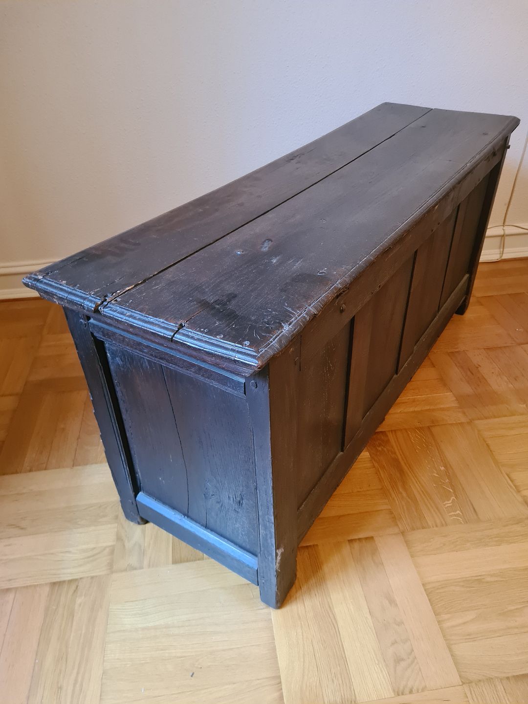 Brudekiste fra 1800 tallet i eg. Fremstår god, robust og ganske pæn for alderen.