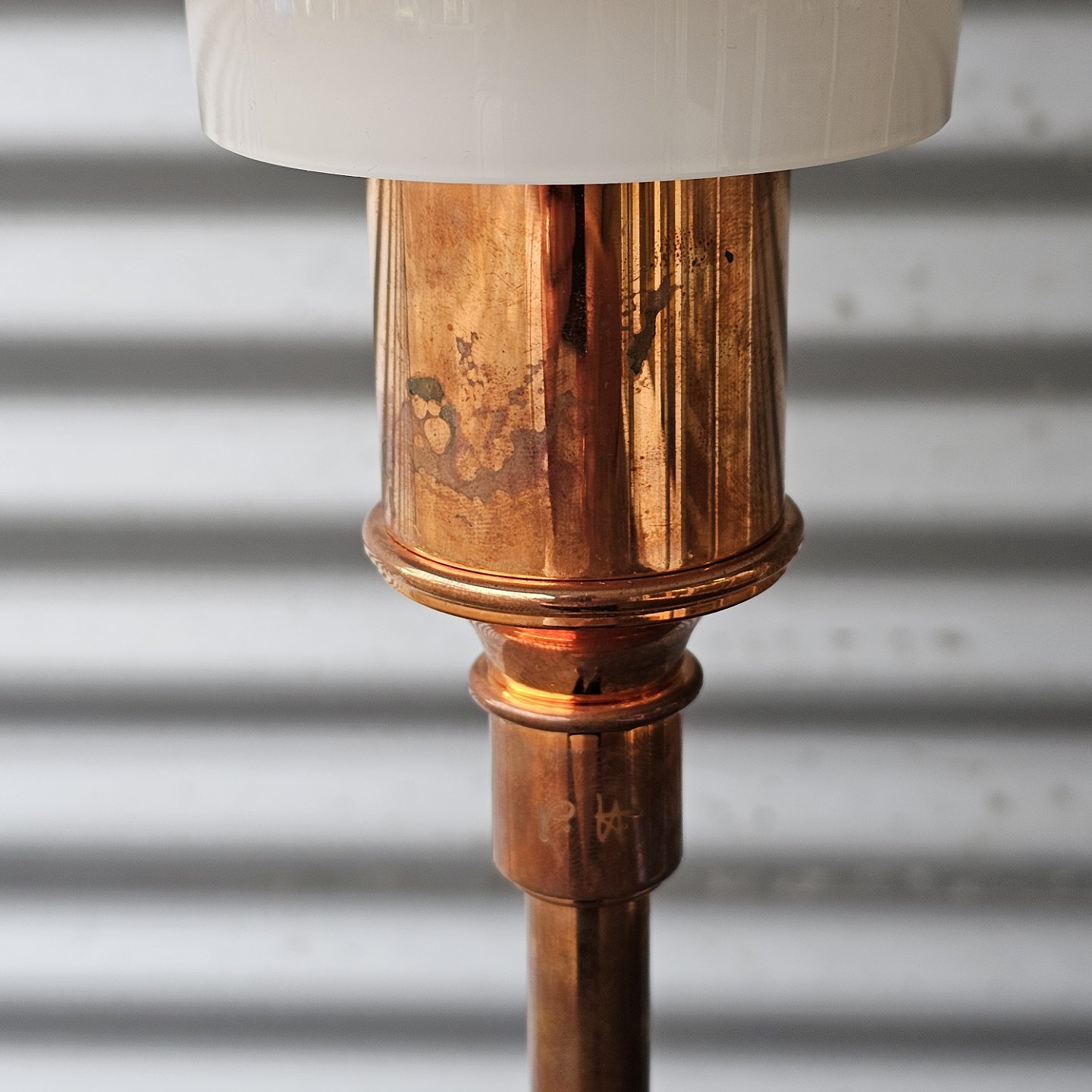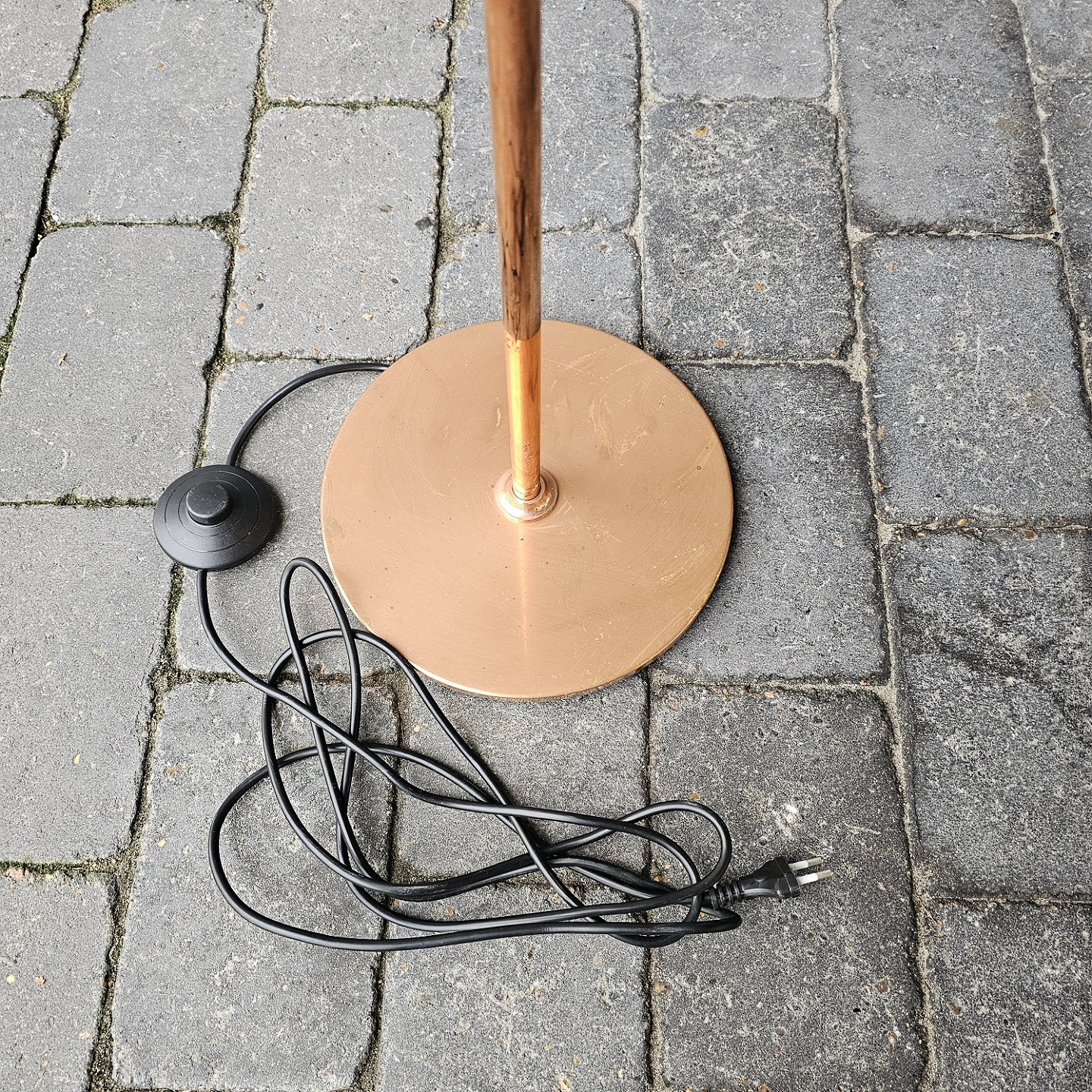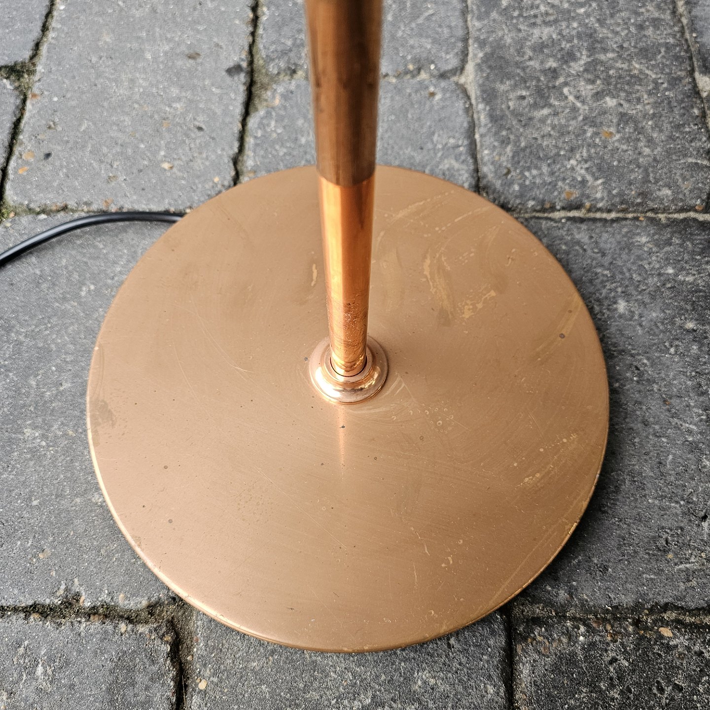 Gulvlampe i kobber og glas med overskærm af kobber