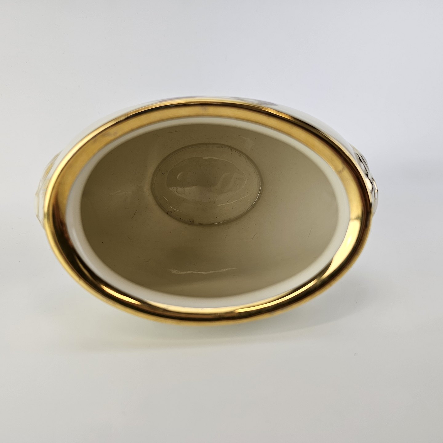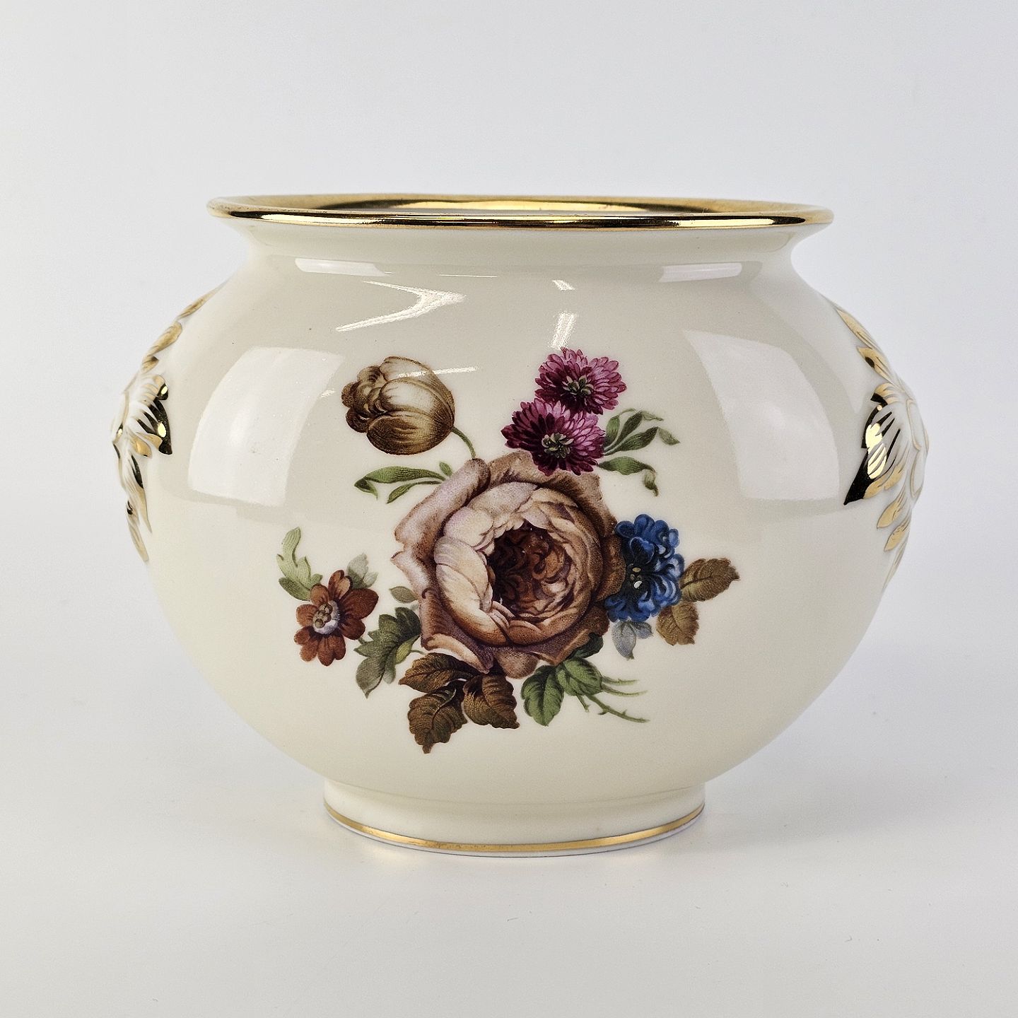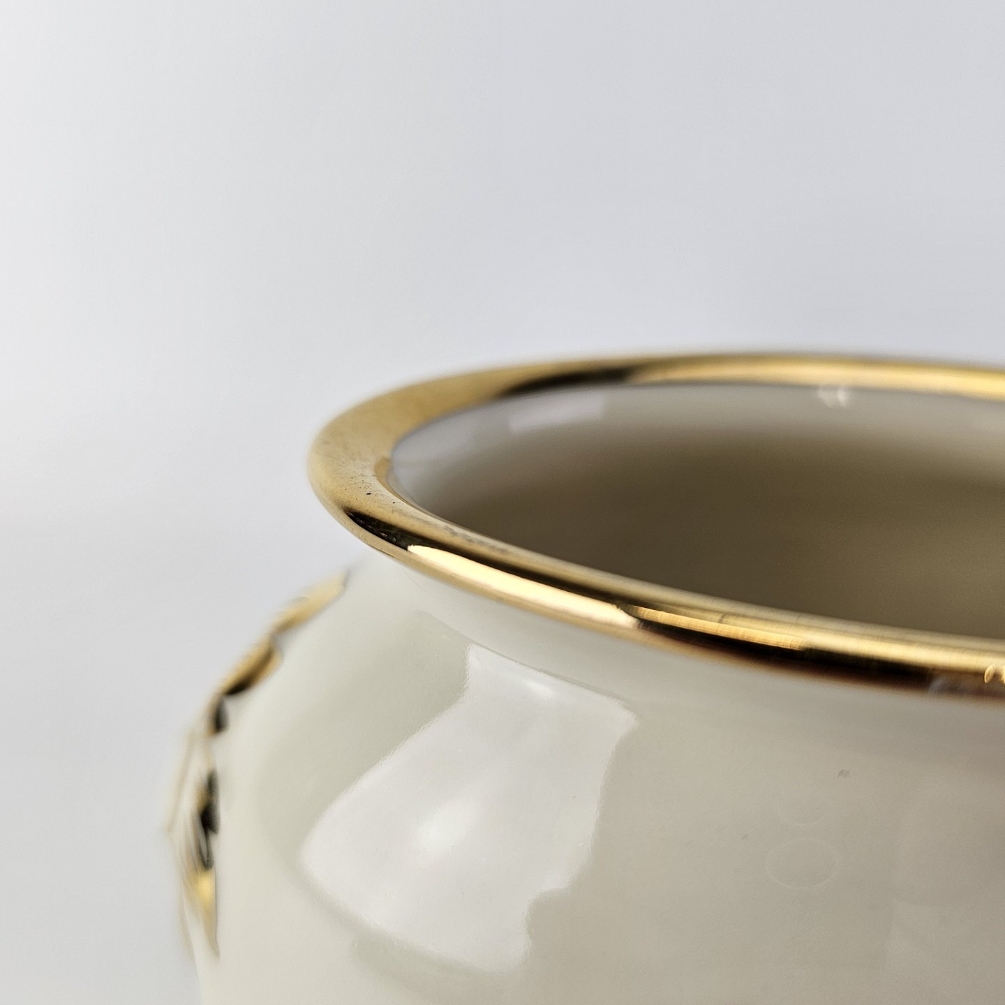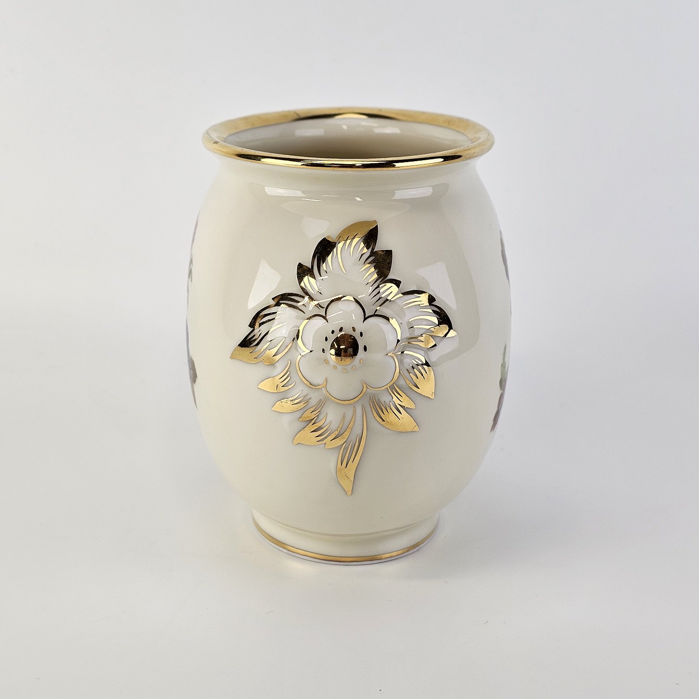 Rosenborg oval vase i cremefarvet porcelæn med guldkant og blomstermotiv