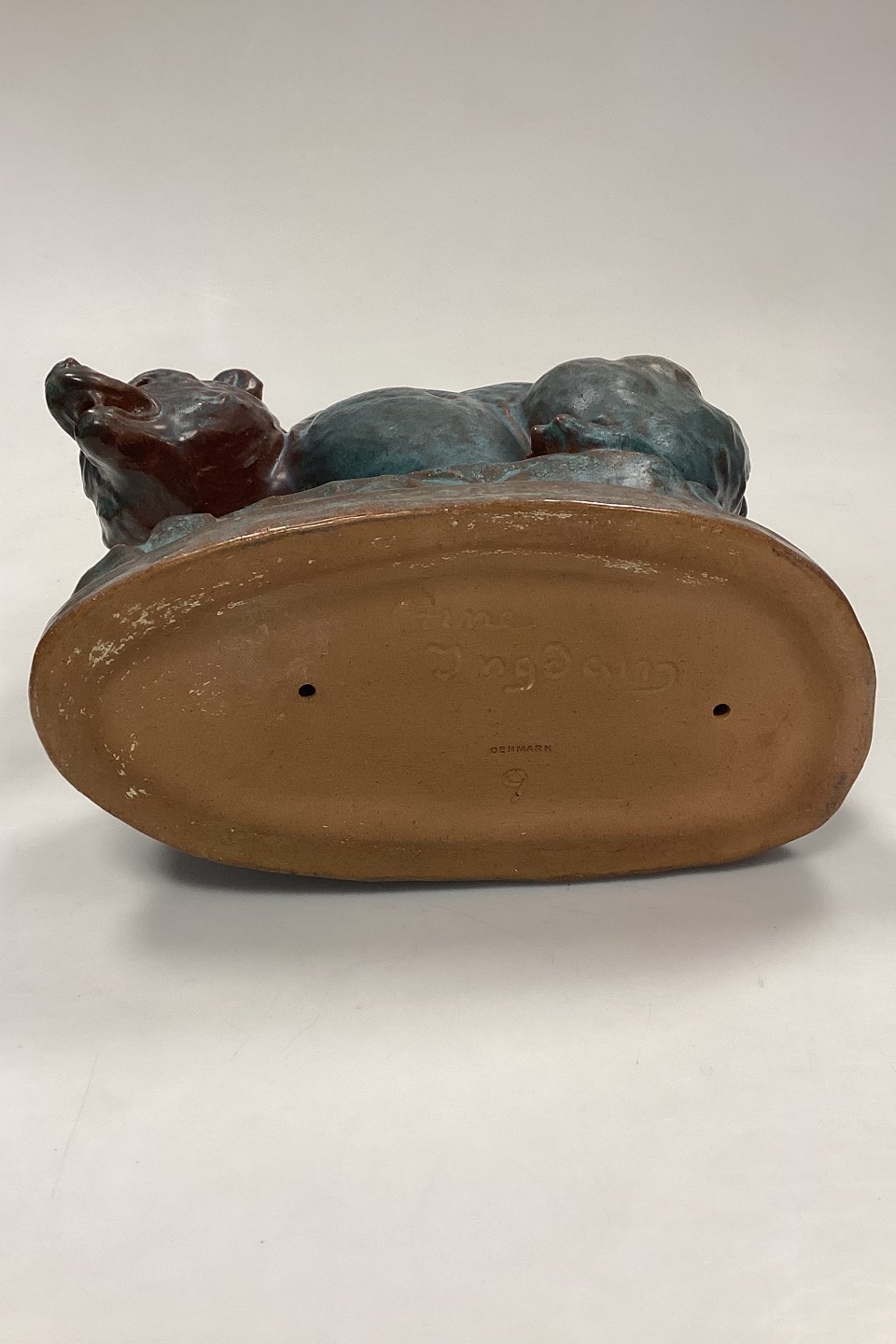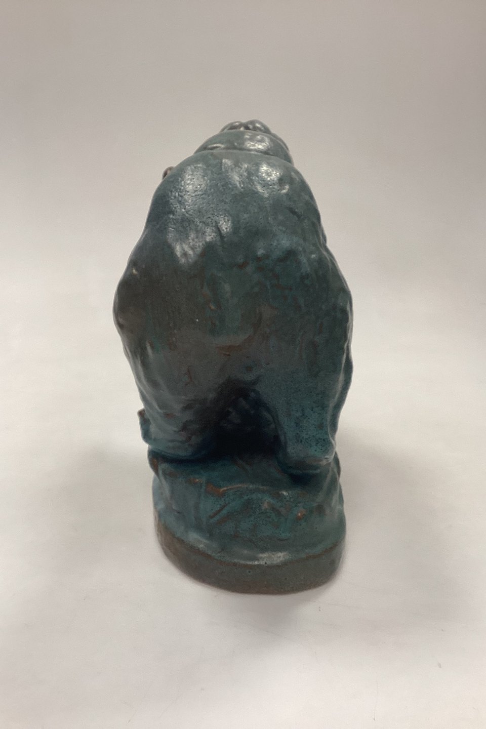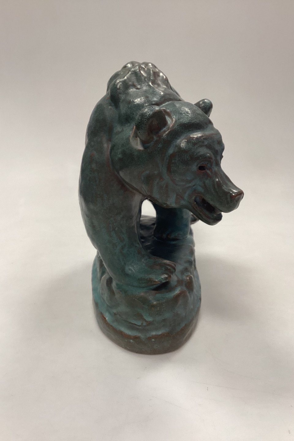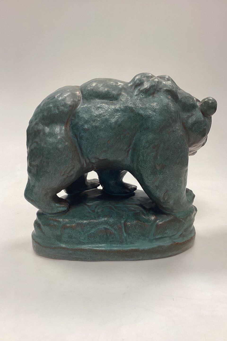 Arne Ingdam Stentøjsfigur af Bjørn. Turkisgrøn glasur på rødbrunt stentøj. Signeret og mærket med et 9-tal. I meget fin stand.