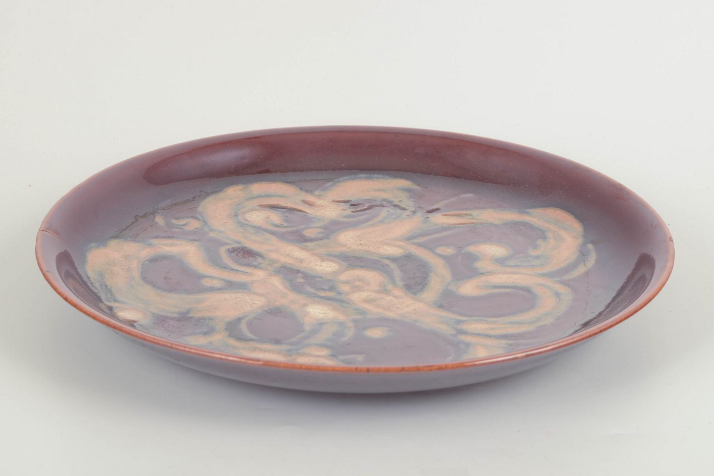 Hånddrejet stentøjsfad med eksperimentel flerfarvet glasur i vinrøde, rosa og blålige toner. Overfladen prydes af et frit ornamentalt mønster i typisk Stålhane-stil, hvor glasuren danner en levende, reliefagtig struktur med høj glans. Et markant eksempel på Stålhånes sene arbejde for Designhuset.