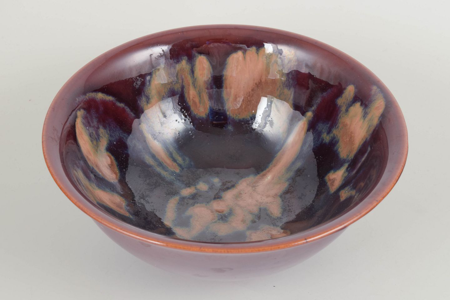 Elegant, hånddrejet stentøjsskål med løstsiddende form og blank, flerfarvet glasur i nuancer af dyb vinrød, blå, sort og kobbertoner, karakteristisk for Stålhånes eksperimenter med flydende glasurer i perioden efter Rörstrand.