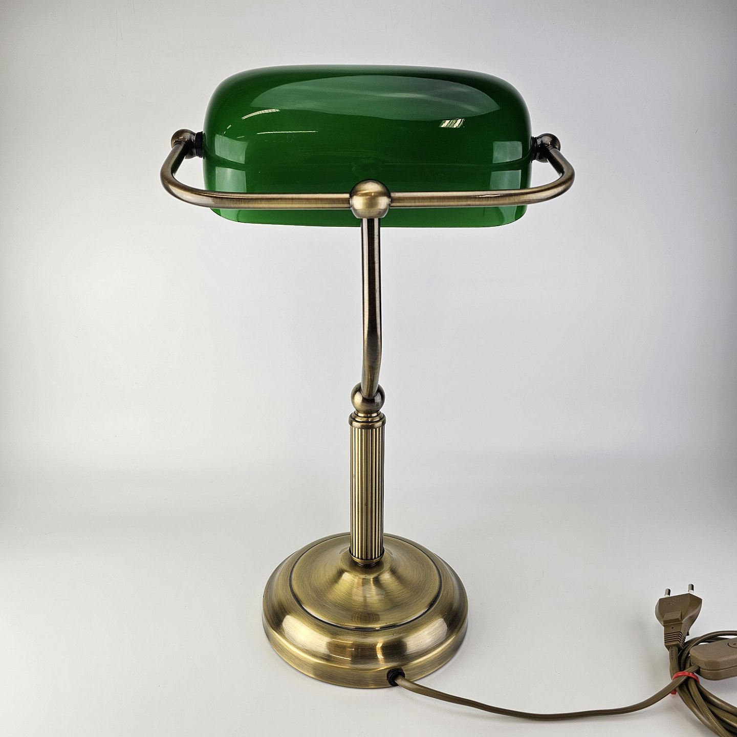 Bordlampe med fod i messing og skærm af grønt/hvid glas