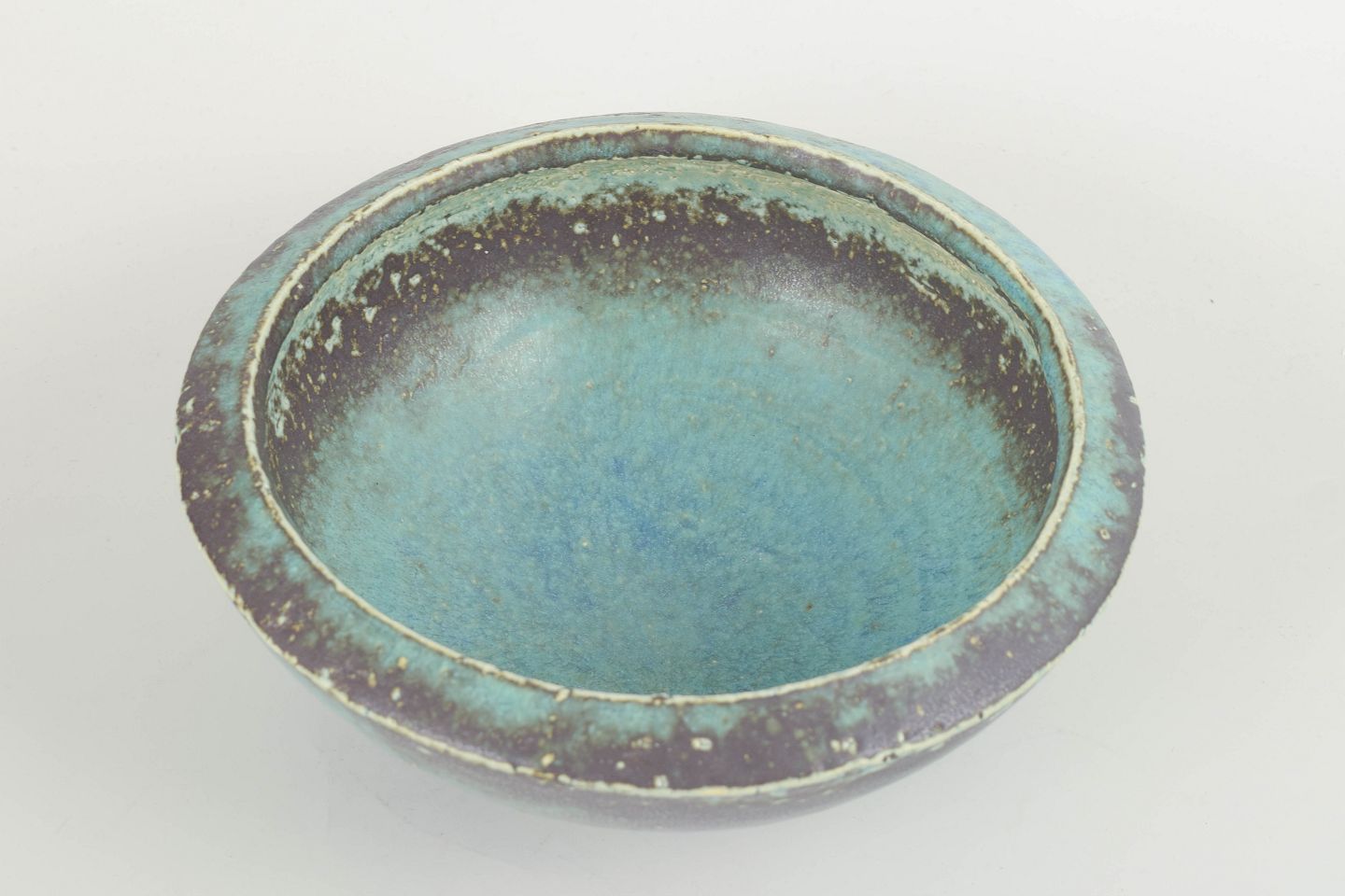 Hånddrejet stentøjsskål med bred, afrundet kant og levende blågrøn glasur over mørk brunlig bund.