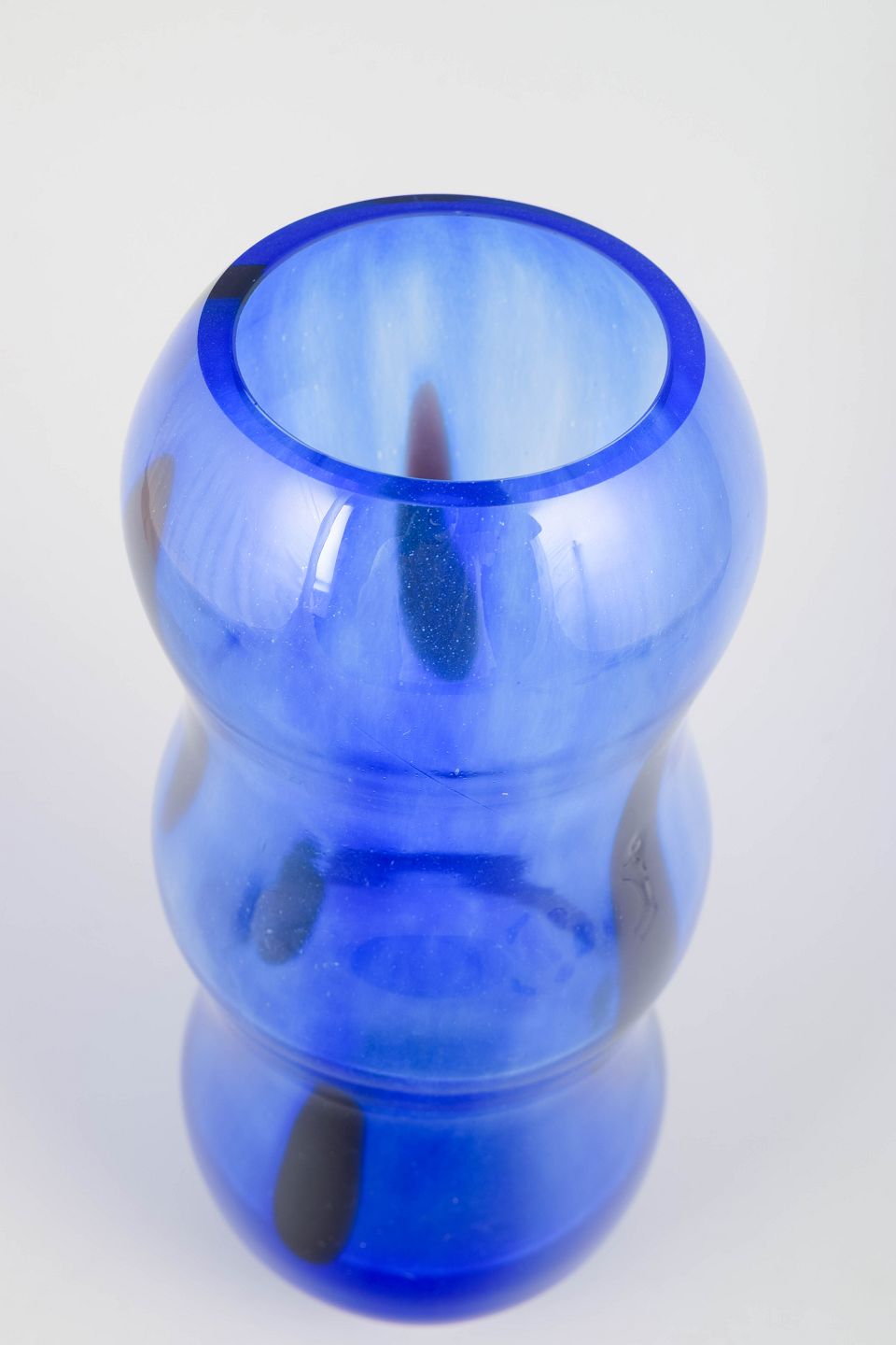 Organisk formet vase i blåt gennemfarvet glas med bløde, bølgende konturer, karakteristisk for Sahlin’s legende formsprog hos Kosta Boda i 1990’erne.