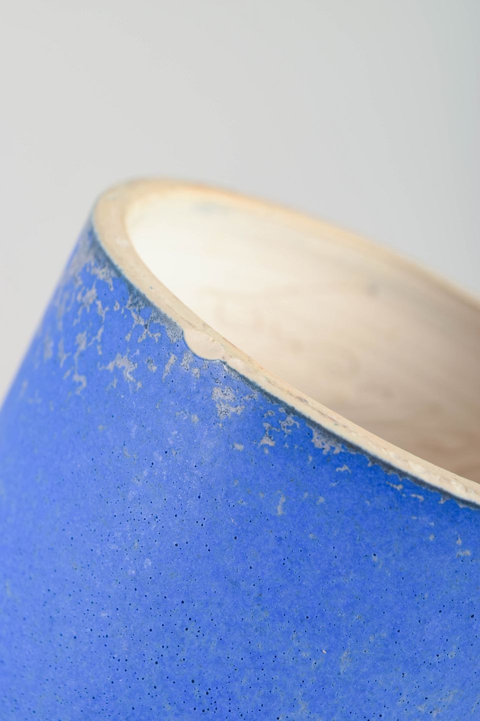 Meget stor, skulpturel studiekeramik-vase i cylindrisk form med karakteristisk todelt profilering og smal, opadstrittende hals. Udført i stentøj med levende, mat blå glasur og fine strukturelle variationer. Et markant og dekorativt unika-arbejde i stor skala.