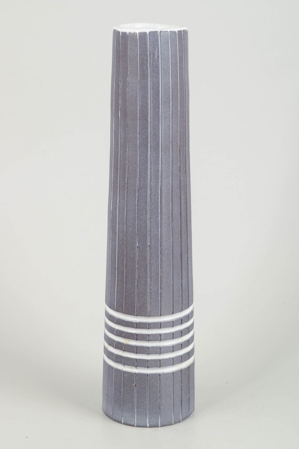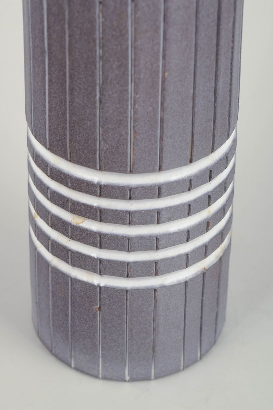 Stor, cylindrisk vase i stentøj med lodrette indskårne riller og hvide horisontale ringdekorationer.