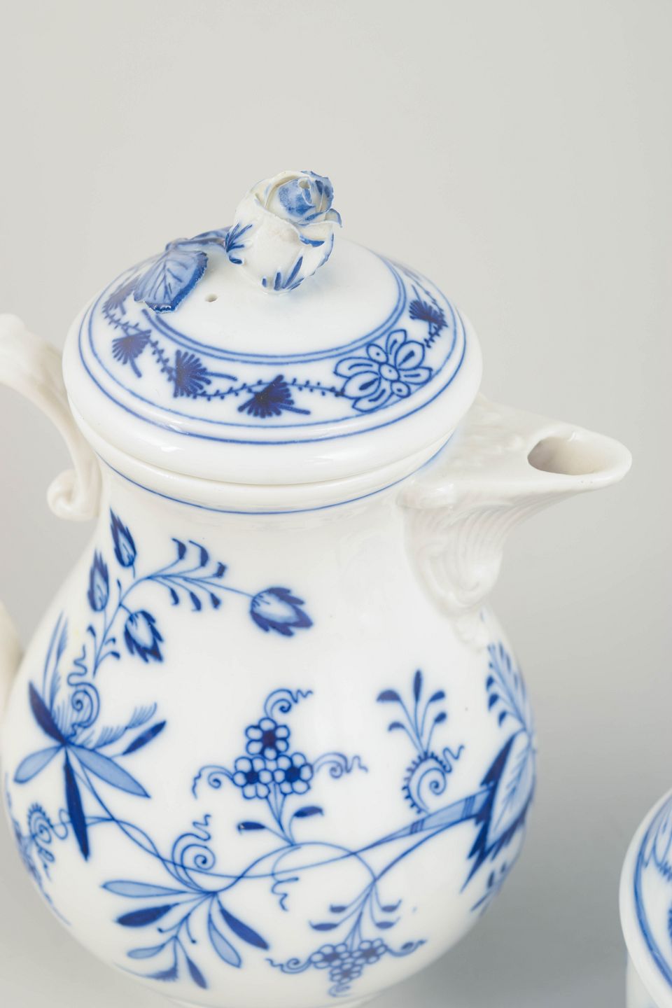 Håndmalet porcelæn fra Meissens klassiske løgmønstret serie. Sættet består af en lille sukkerskål med låg samt en elegant mokkakande med låg og hank. Begge dele er smukt dekoreret med de karakteristiske blå blomster- og rankemotiver.