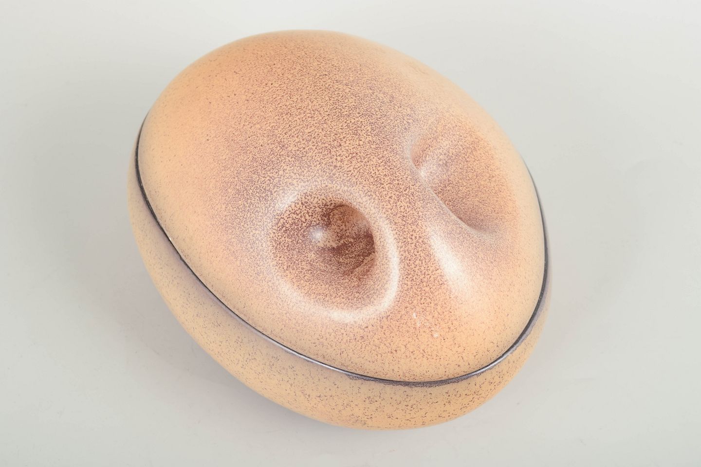 Organisk formet lågkrukke i stentøj med en glat, blødt modelleret silhuet og diskret punktglasureffekt i sand- og terracotta toner. Lågets form er skulpturel og næsten biomorf, typisk for Åströms eksperimenterende udtryk i perioden.
