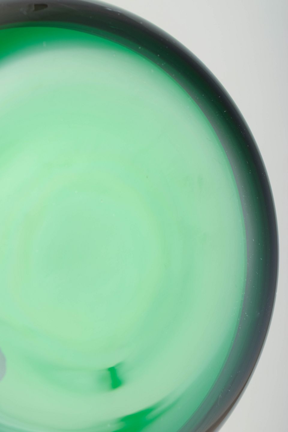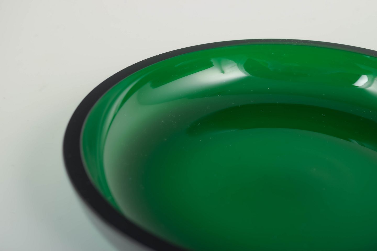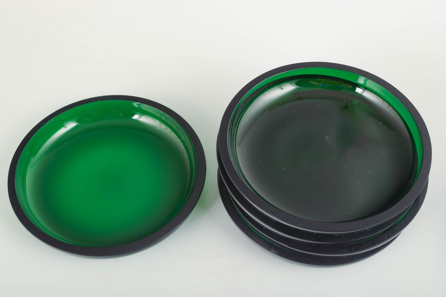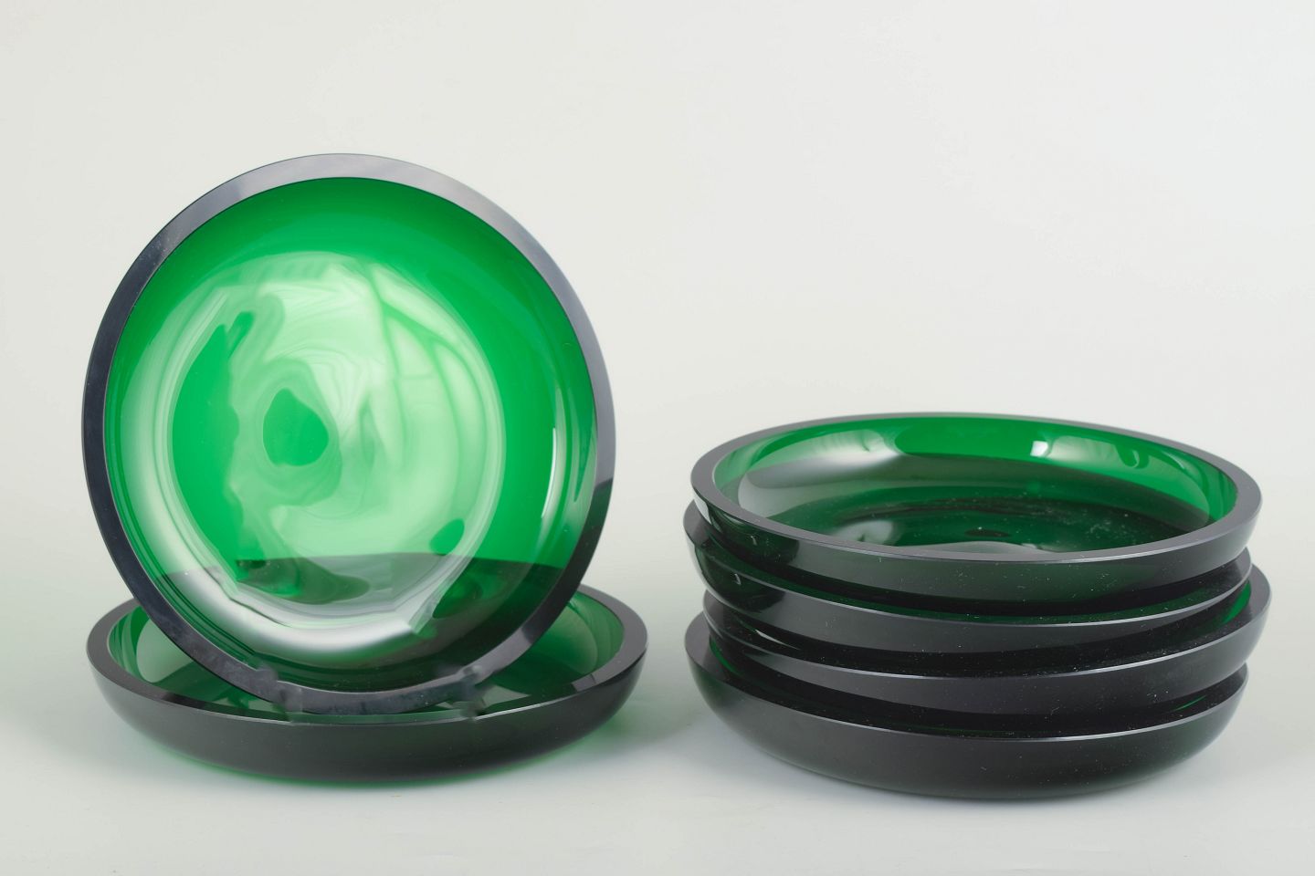Smukke tallerkener i dyb, smaragdgrøn glas med organisk, svungen farvetegning og tykkere mørk kant. Et dekorativt sæt fra Svenskt Tenn, typisk for Josef Franks legende og farverige formsprog.