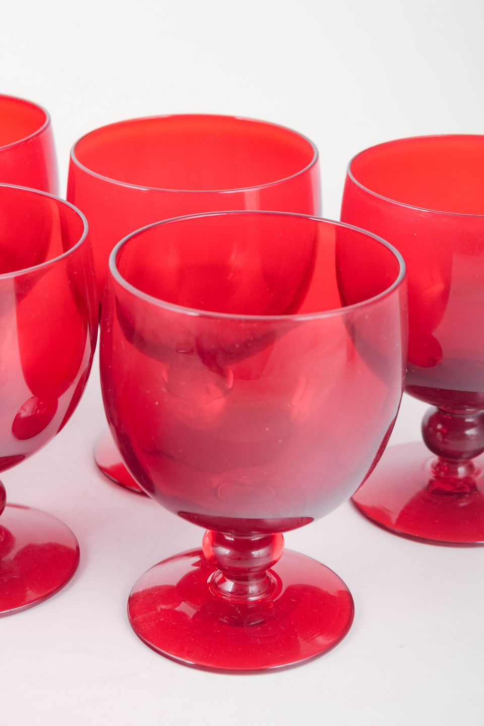 Sæt af seks rubinrøde rødvinsglas i klassisk form med rund kupa og profildrejet stilk. Den dybe røde tone er karakteristisk for Reijmyres midt-århundrede produktion.
