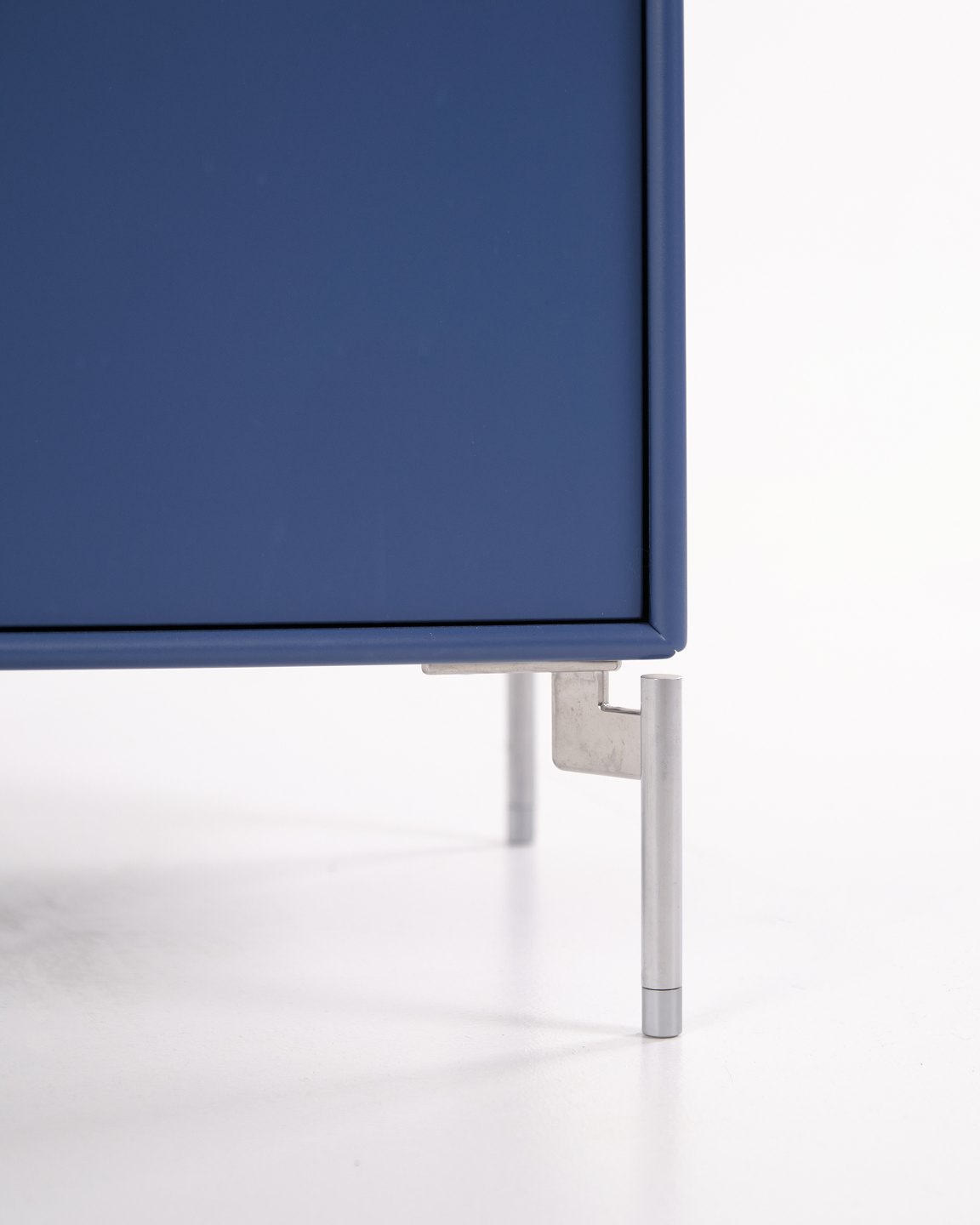 Montana cabinet / filing cabinet in blue, fitted with chrome legs. Features three drawers and one door, ideal for storage in an office, living room or hallway. Classic Montana module with high functionality and timeless design.