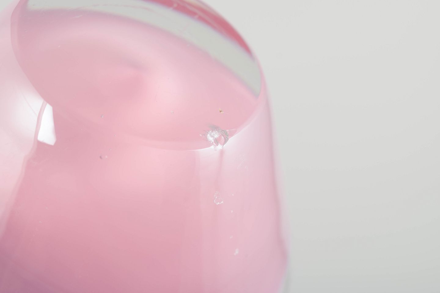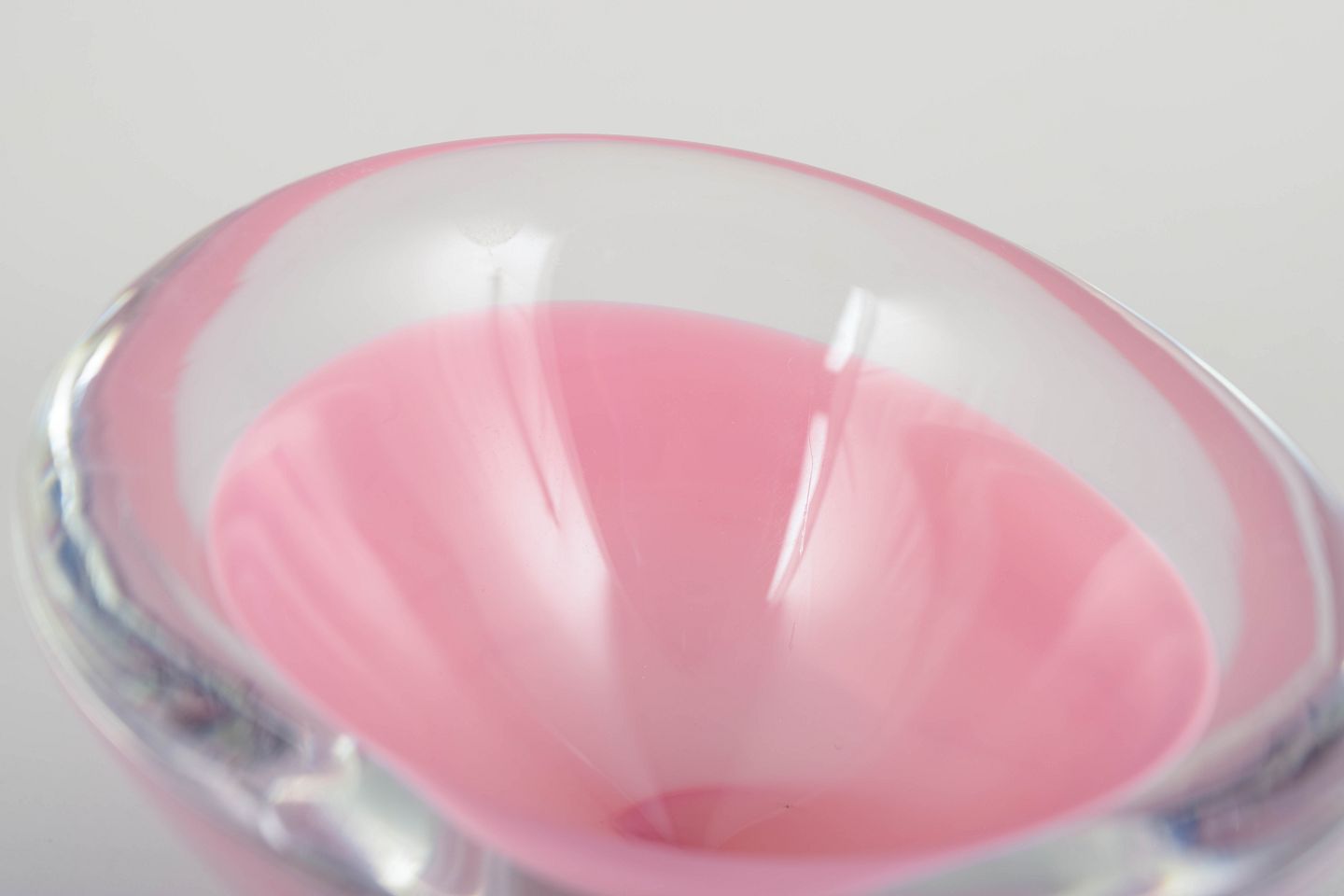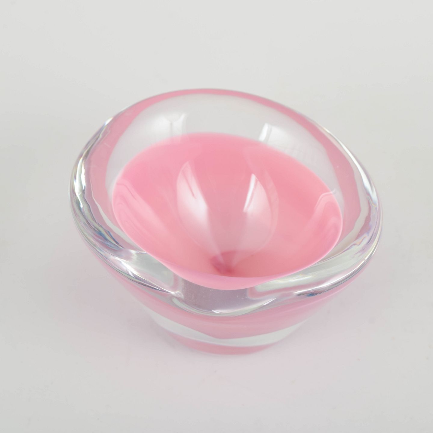 Lille, organisk formet skål i mundblæst glas med klar kant og lagdelt farvespil i rosa og hvidt, typisk for Murano glas fra perioden.