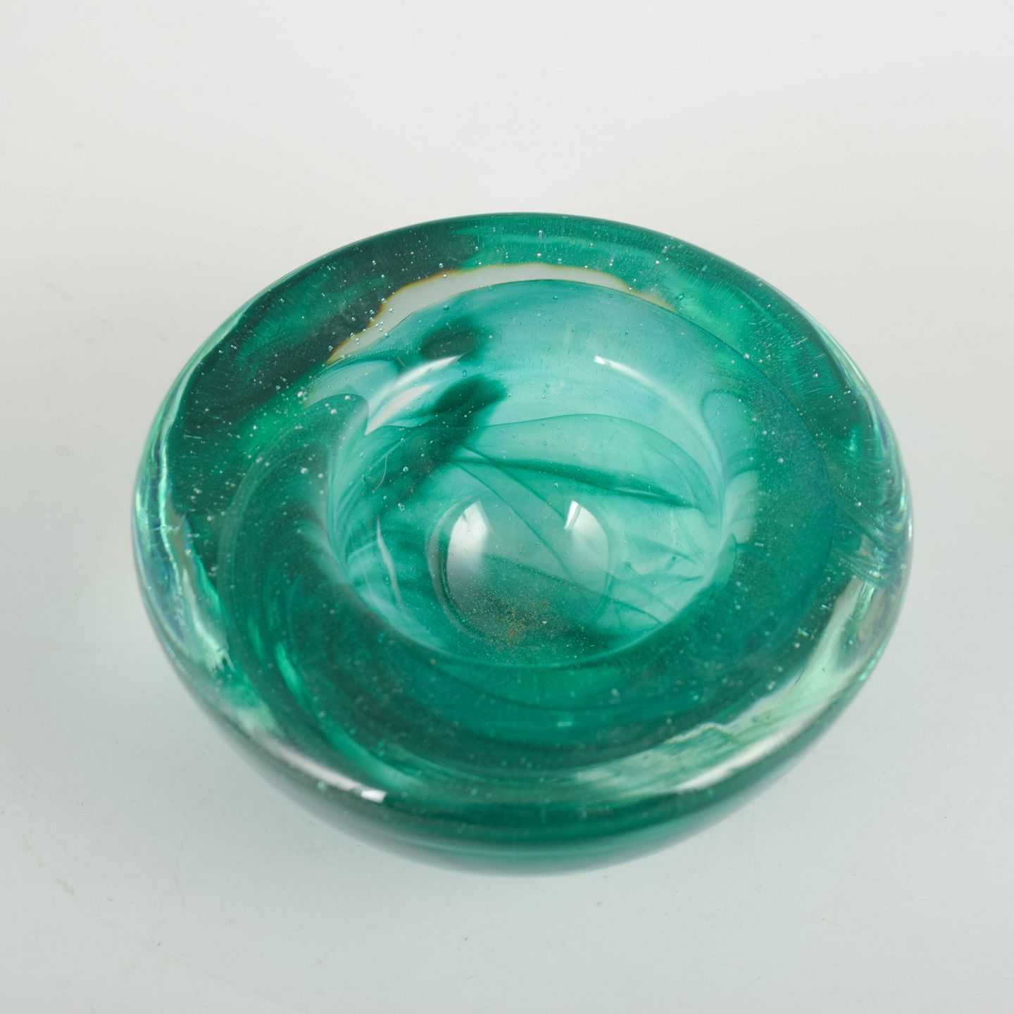 Organisk formet skål i mundblæst glas med lagdelt farvespil i klare grønne og transparente toner, typisk for Skandinavisk kunstglas fra perioden.