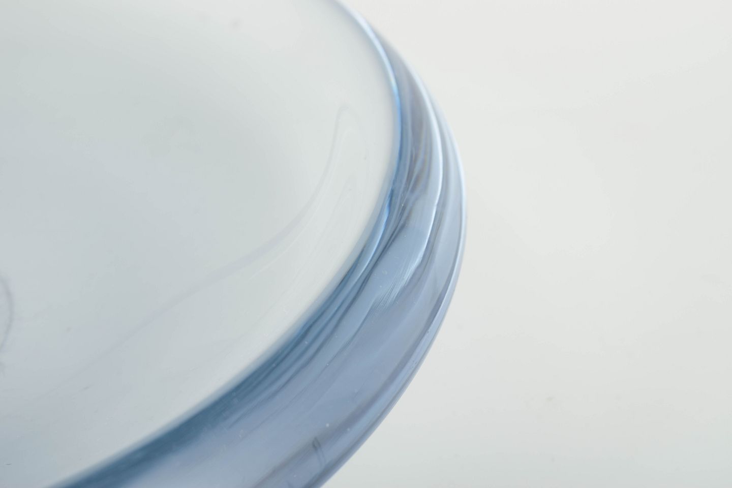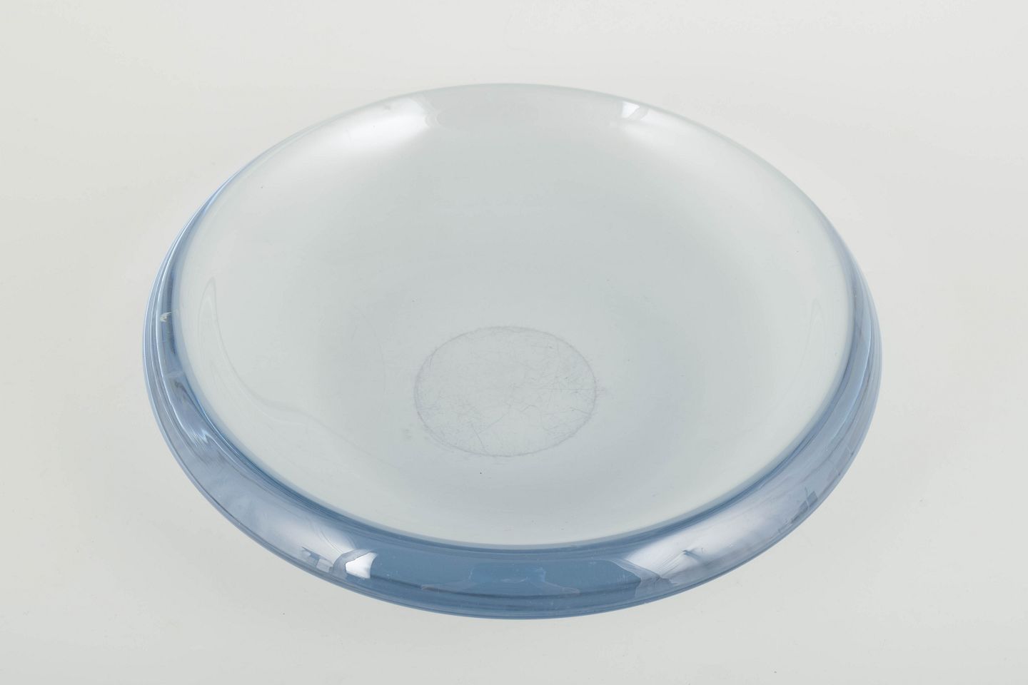 Organisk formet mundblæst skål i lys blå, næsten transparent glas med tykke vægge og blød afrundet form, typisk for skandinavisk glasdesign i perioden.