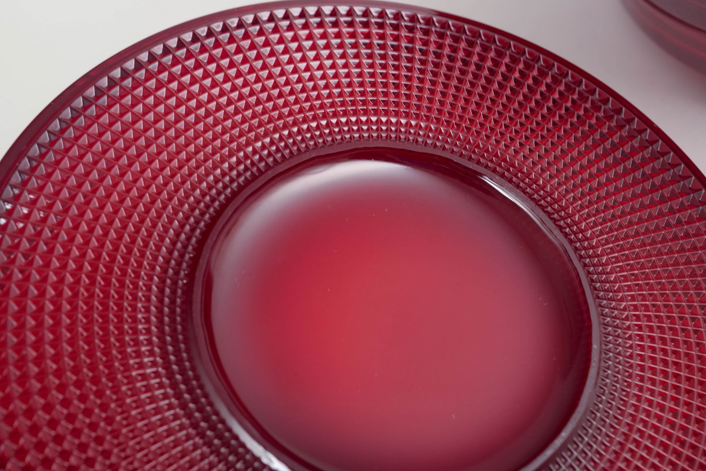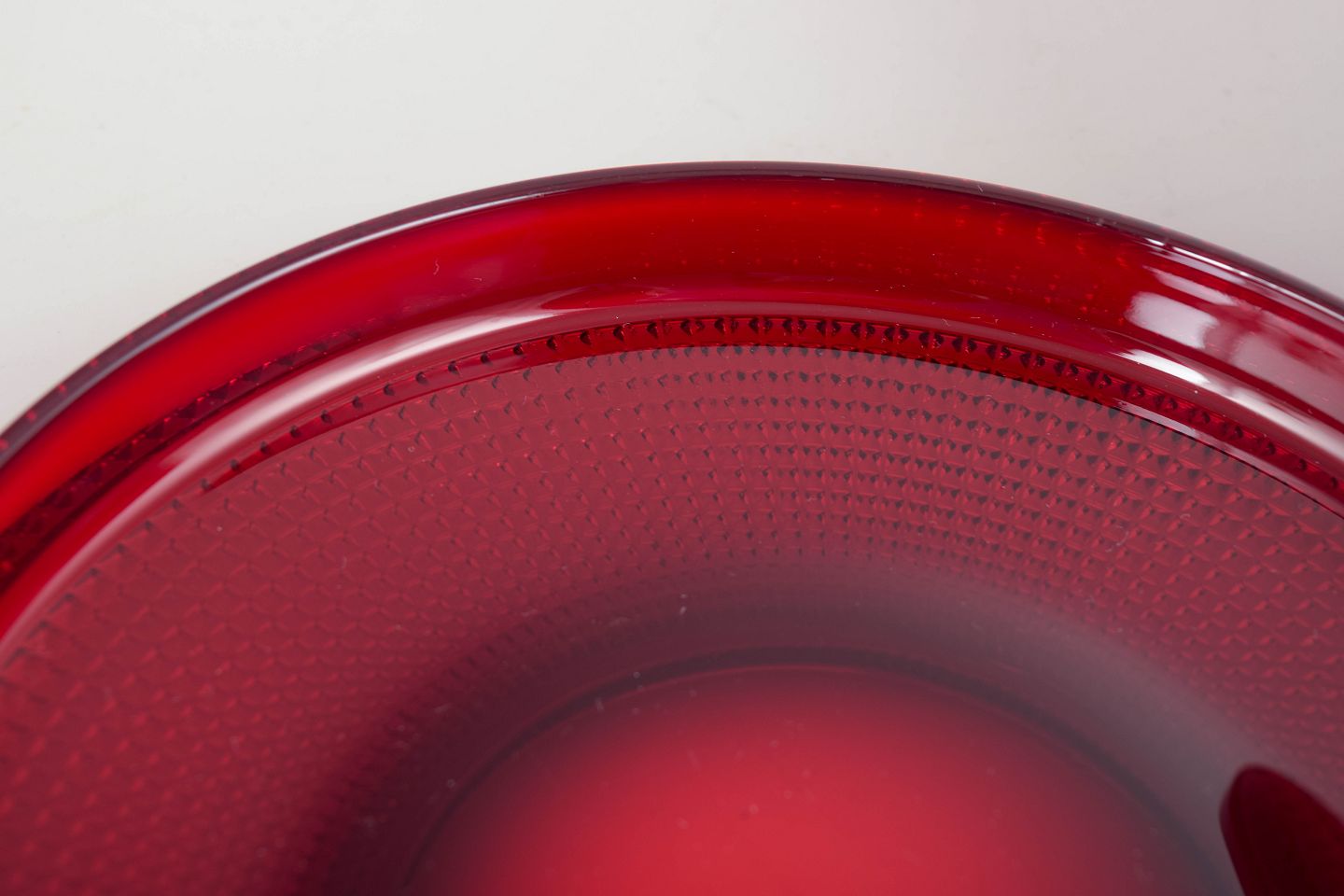 Sæt med seks flade tallerkener i dybt rubinrødt glas fra Gullaskruf, model “Vineta”, kendt for sin karakteristiske optiske prikkestruktur og intense farvemætning. Et smukt og tidstypisk eksempel på svensk glasdesign.