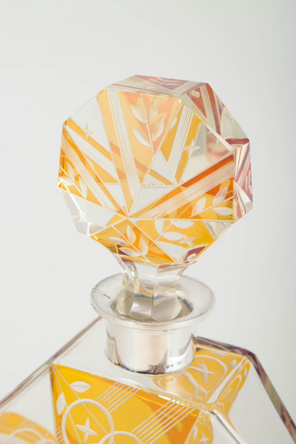 Facetteret Art Deco-karaffel i slebet og dekoreret krystalglas med orange/guldtonet krystalglasur og geometriske ornamenter. Original facetteret prop og sølvmontering.