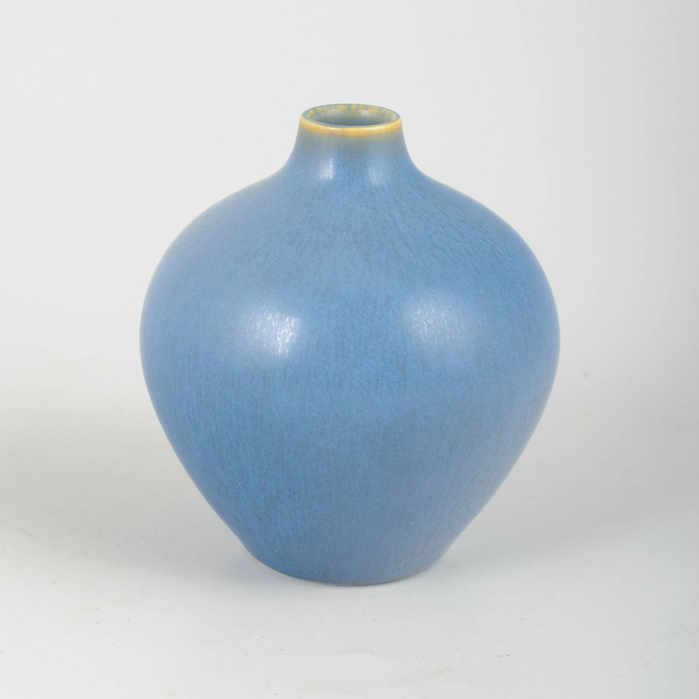 Smuk, lille stentøjsvase i klassisk afrundet form med silkemat lyseblå glasur og diskret nuanceret overflade. Typisk for Per Linnemann-Schmidts elegante, rene formsprog.