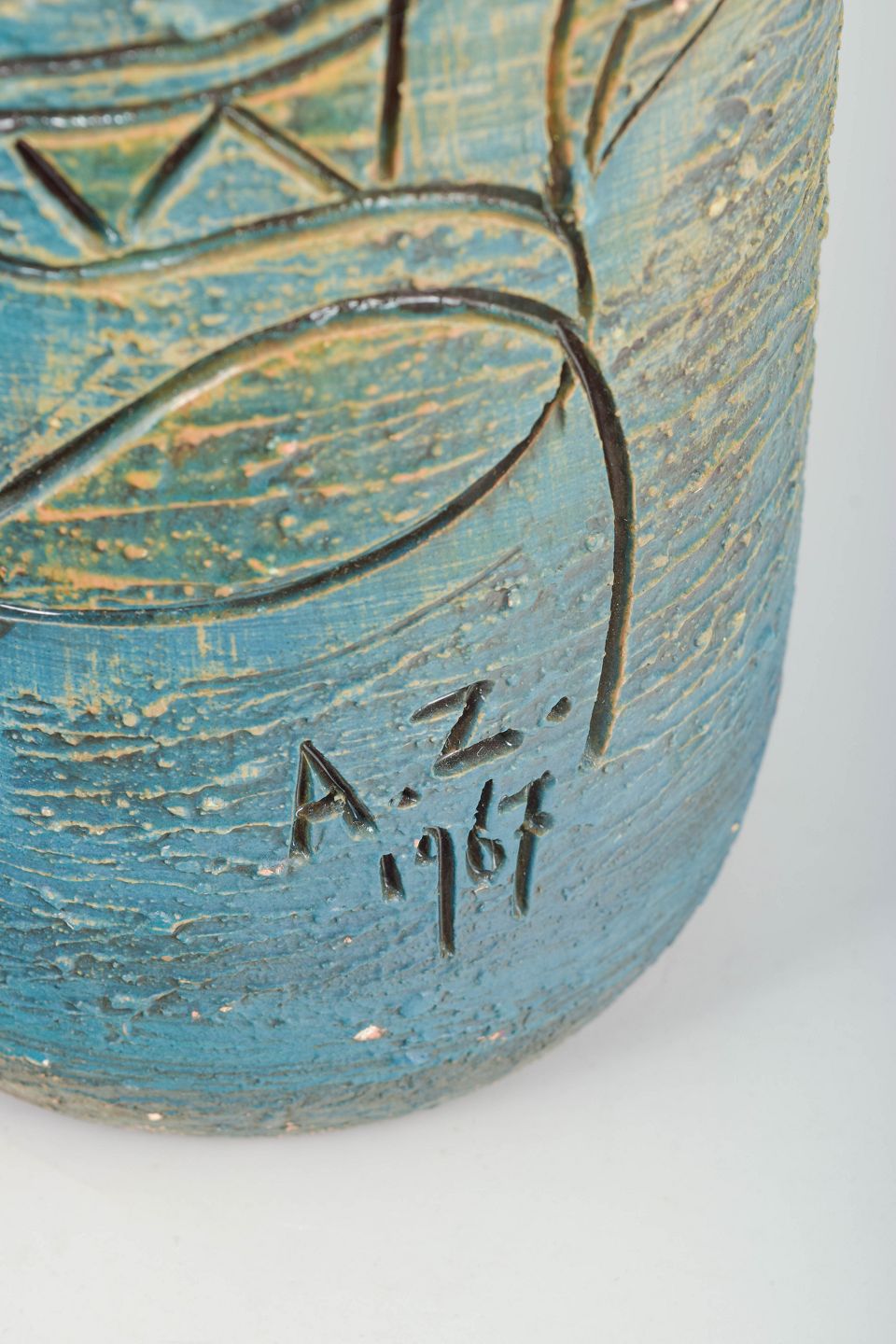 Ekstremt dekorativ og høj cylindrisk gulvvase i chamotte-ler med rillet overflade og karakteristisk inciseret dekoration af stiliseret fugl og blomster. Glasur i blå, grønne og sandfarvede nuancer.