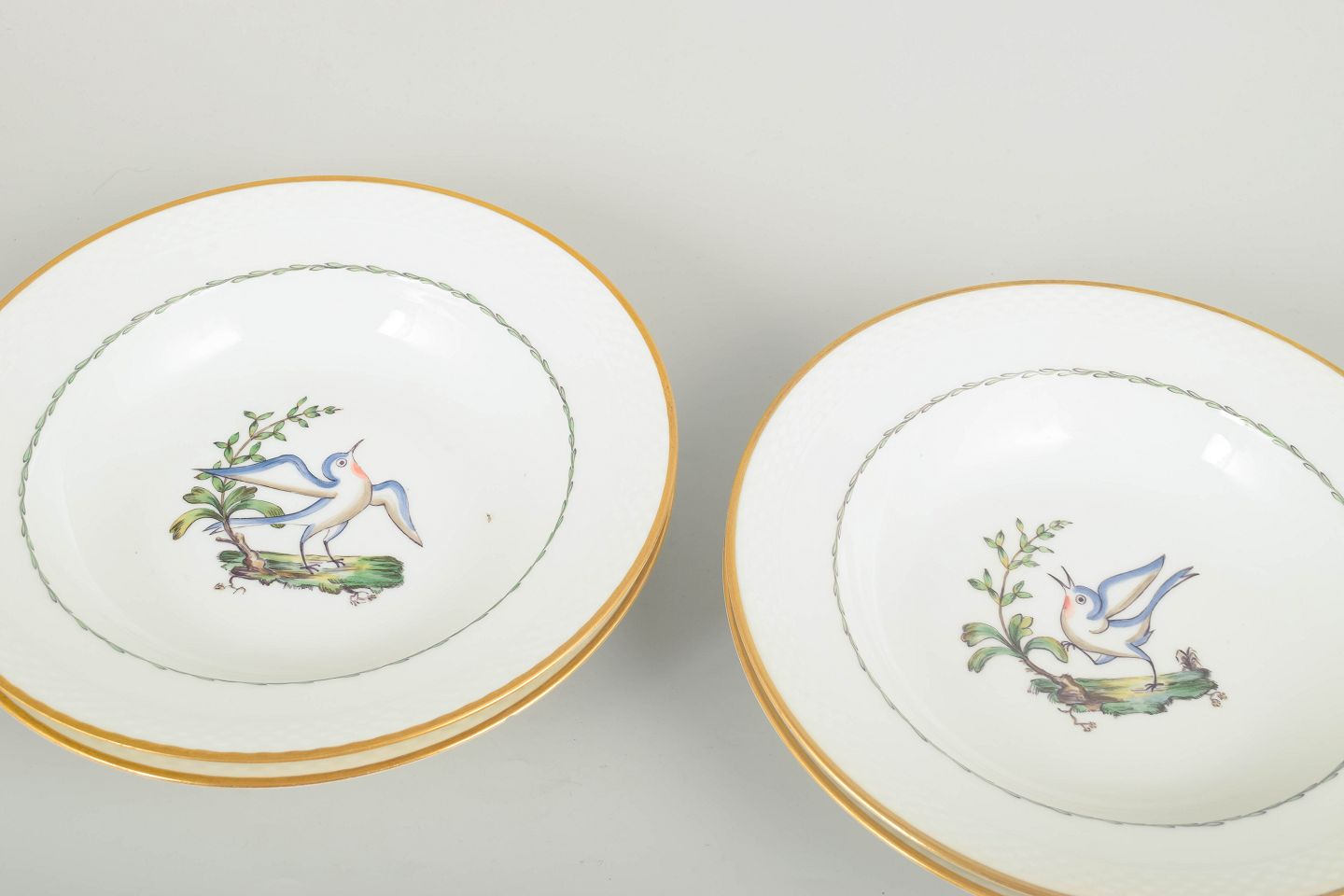 Sjældne dybe tallerkener i porcelæn fra Royal Copenhagen med motiv af fugle og botaniske elementer (model 550/8107). Hver tallerken er kantet med guldrand og har et elegant, let riflet fletrelief langs kanten.