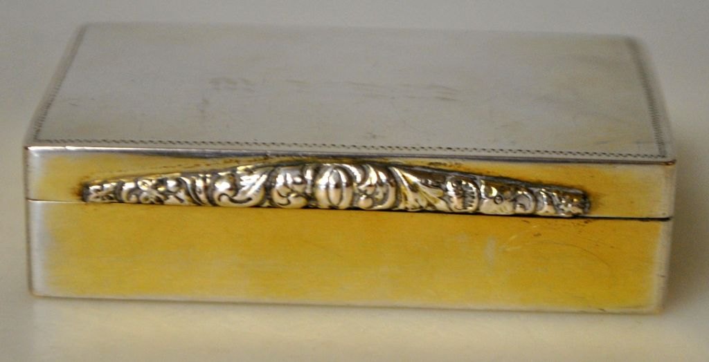 Peter Erichsen (1826 - 1869) Haderslev, Danmark: Lugtedåse i sølv. Stemplet med mestermærke og byvåben. Indvendig lueforgyldt og gitter med rococo mønstre med springende hjort, hus og træer. 6,5 x 4,5 x 1,8 cm. Vægt: 54 gram.