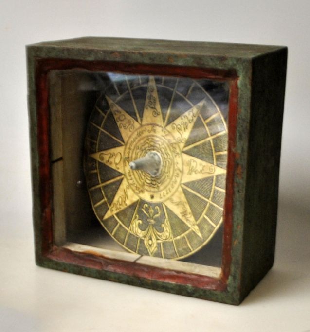 Kompas, 1777, Lübeck, Tyskland. Udformet af Joachim Burmeister. Kompasskive med dekorationer. I hus af bemalet træ. 15,5 x 15,5 x 8 cm.