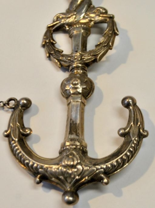 Needle holder, silver, 19th century. With chain. Decorated with anchor and dolphins. Unmarked. With engraving: CM. L.: 11.5 cm.