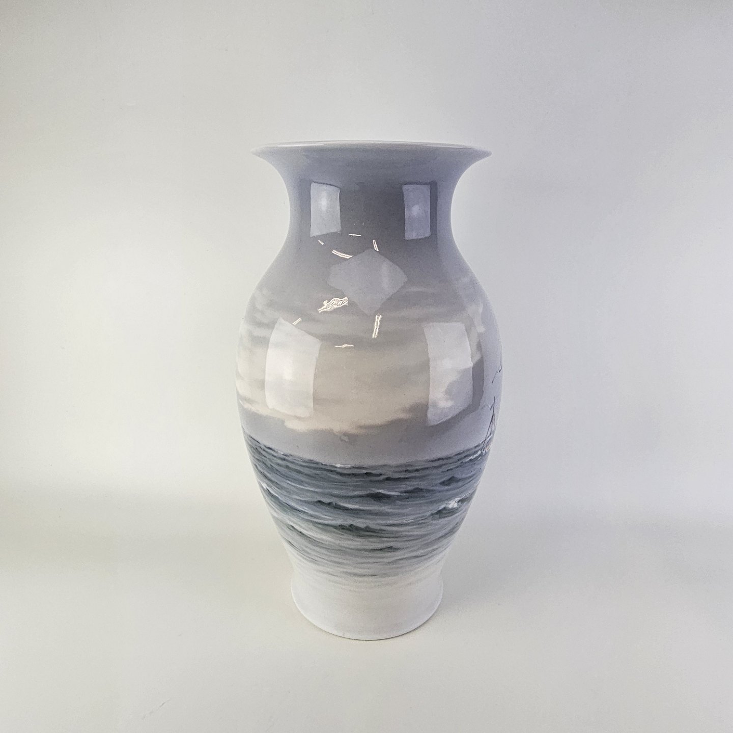 Vase i kongeligt porcelæn med motiv af fiskekuttere til søs