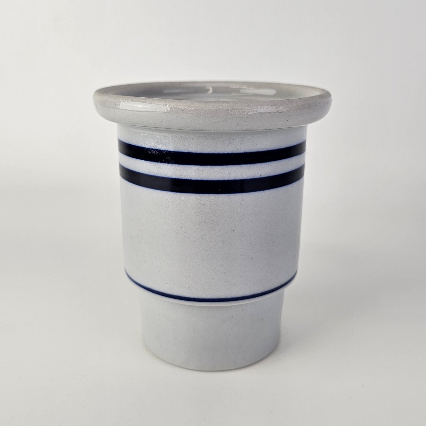 Krukke i glaseret stentøj med dekoration af tre blå striber