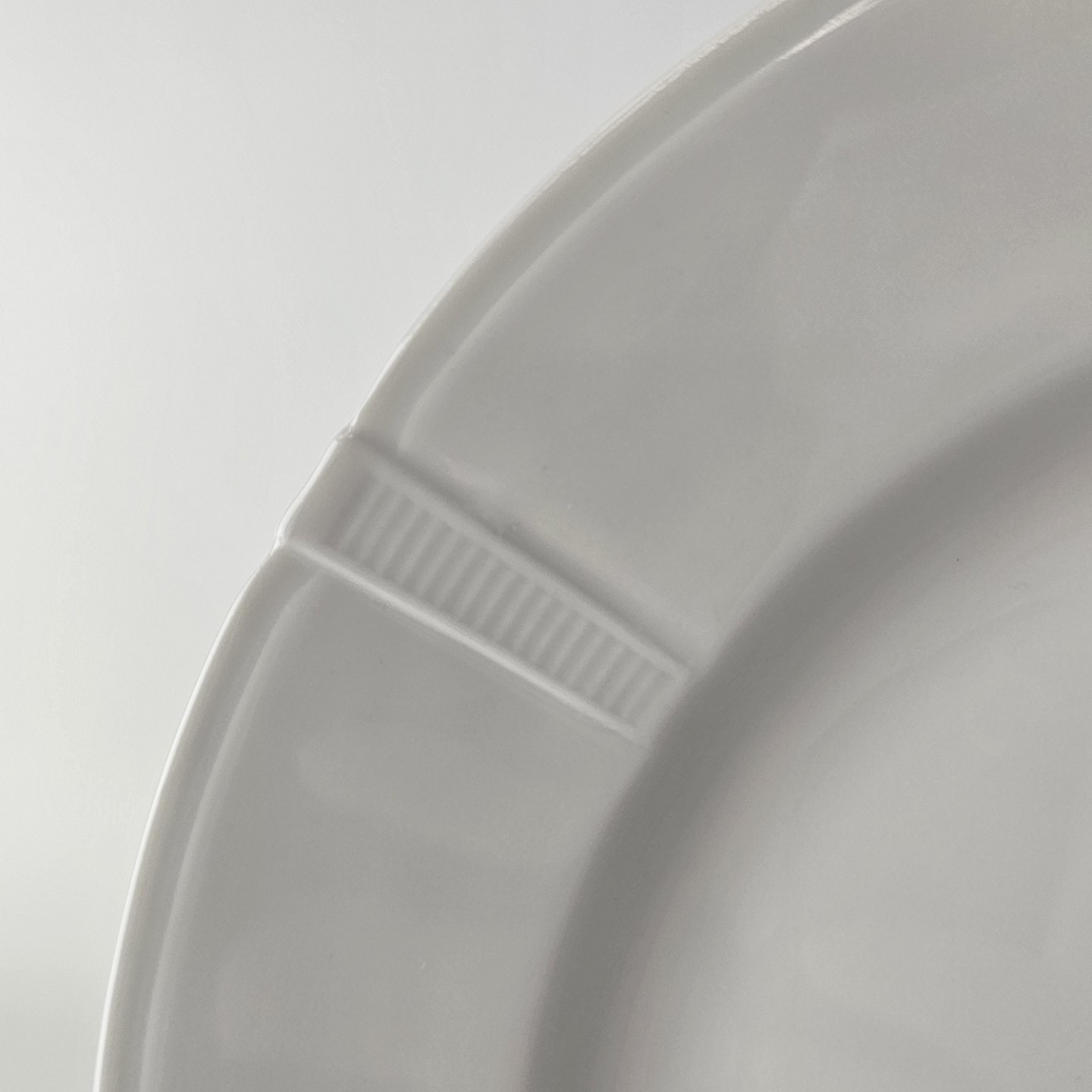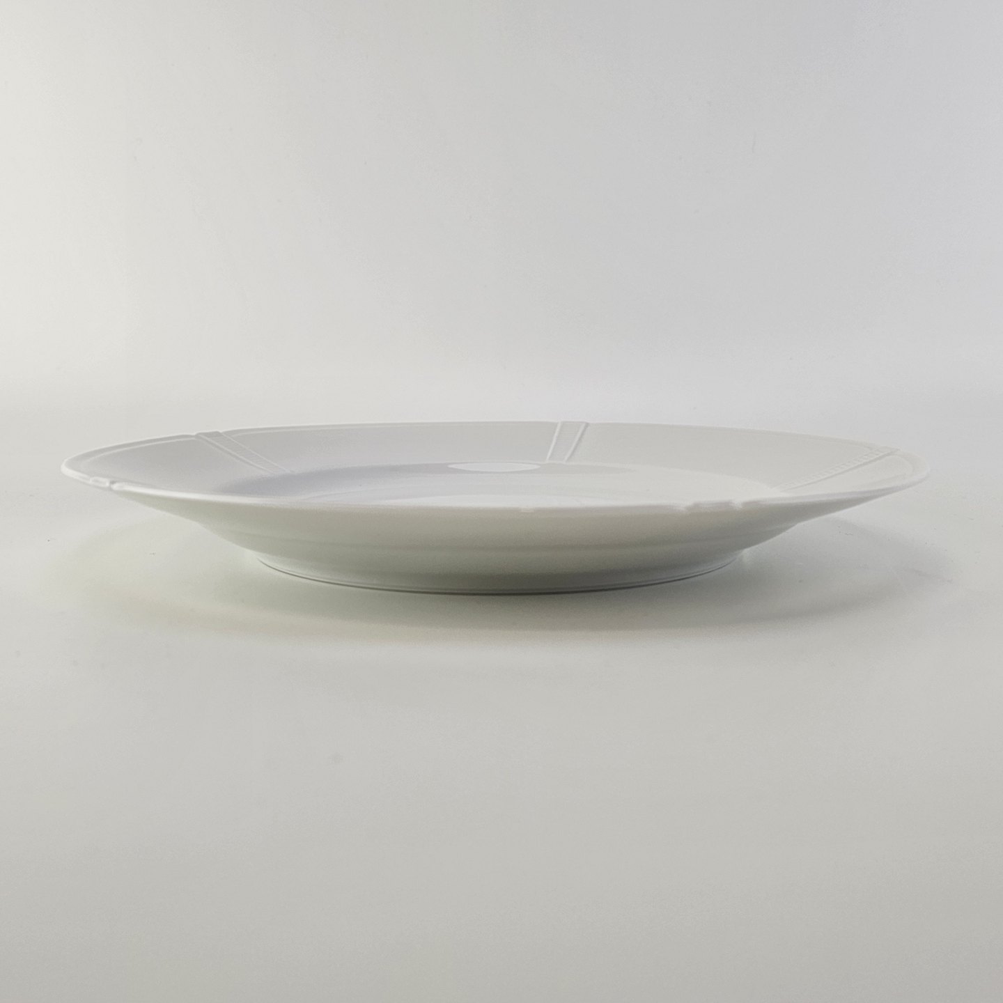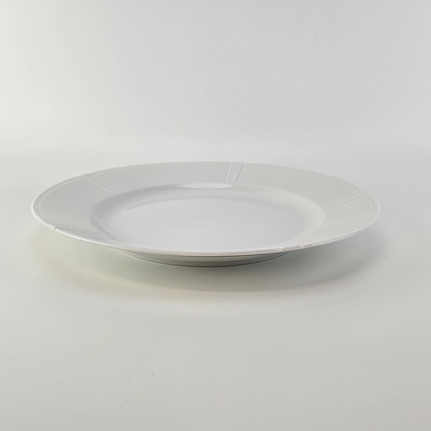 Flad middagstallerken i hvidt porcelæn fra stellet Rosenborg