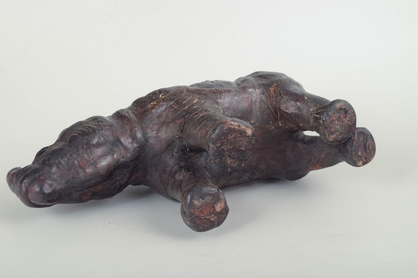 Håndlavet figur af et næsehorn udført i formet og syet læder, muligvis solgt gennem Liberty & Co., London. Figuren har flot modellerede detaljer og en naturlig patina, der fremhæver det håndværksmæssige udtryk.