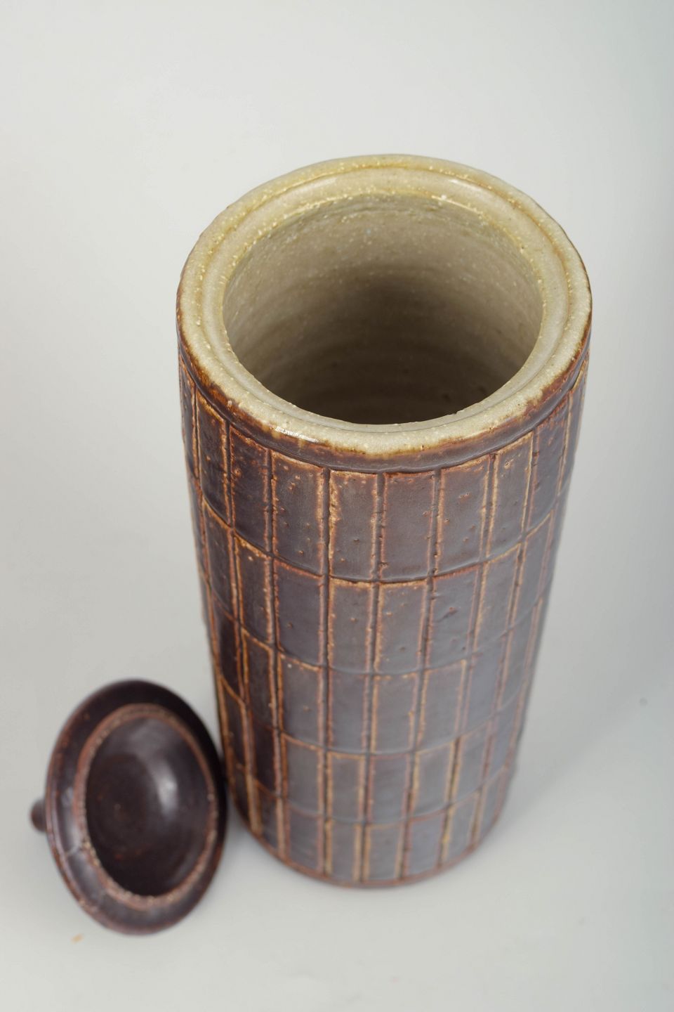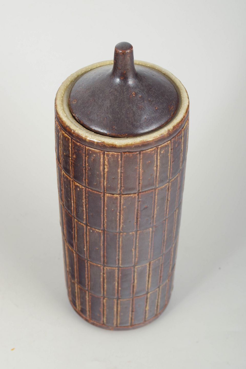 Høj cylindrisk stentøjsvase med fast konisk låg, udført i den karakteristiske brune Palshus-glasur med lodrette og vandrette relieflinjer. Et markant og elegant eksempel på værkstedets modernistiske formsprog.