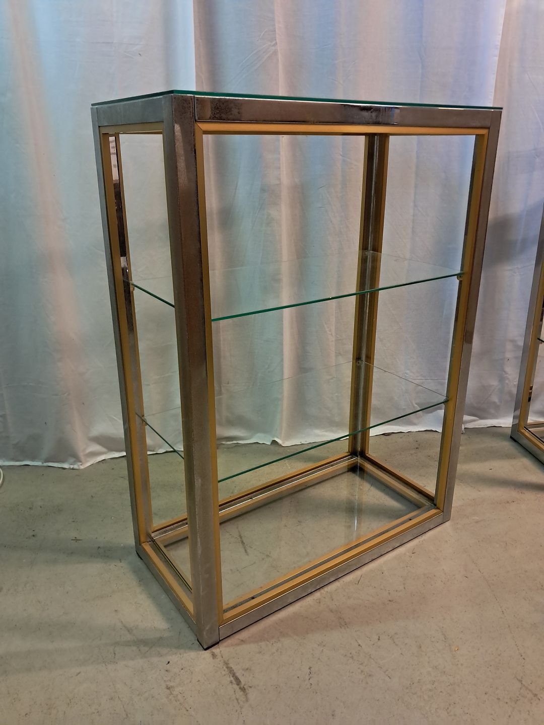 Forkromet reol i metal med glashylder, fra 1980erne.