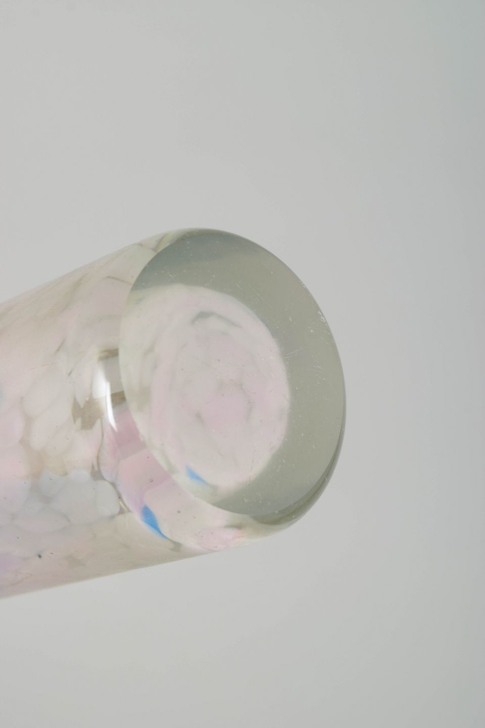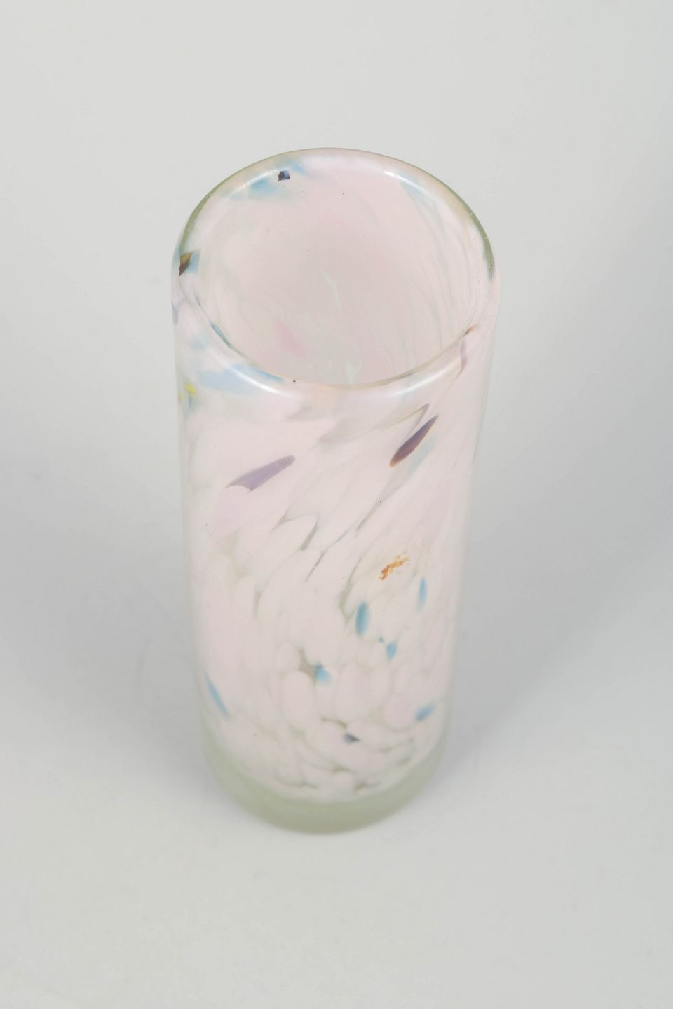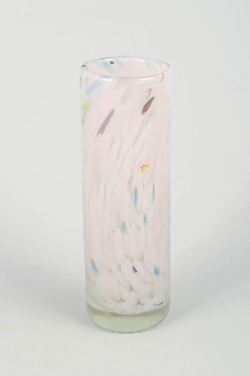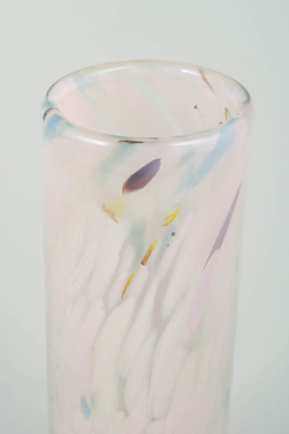 Mundblæst cylinderformet glasvase af Per Lütken med lette, fjeragtige indsmeltede farveindslag i hvide, rosa, blå og enkelte ravfarvede toner. Udtrykket er luftigt og elegant, med en diskret organisk bevægelse i farverne typisk for Lütkens mere eksperimenterende dekorative glasarbejder.