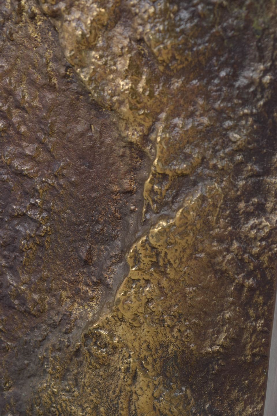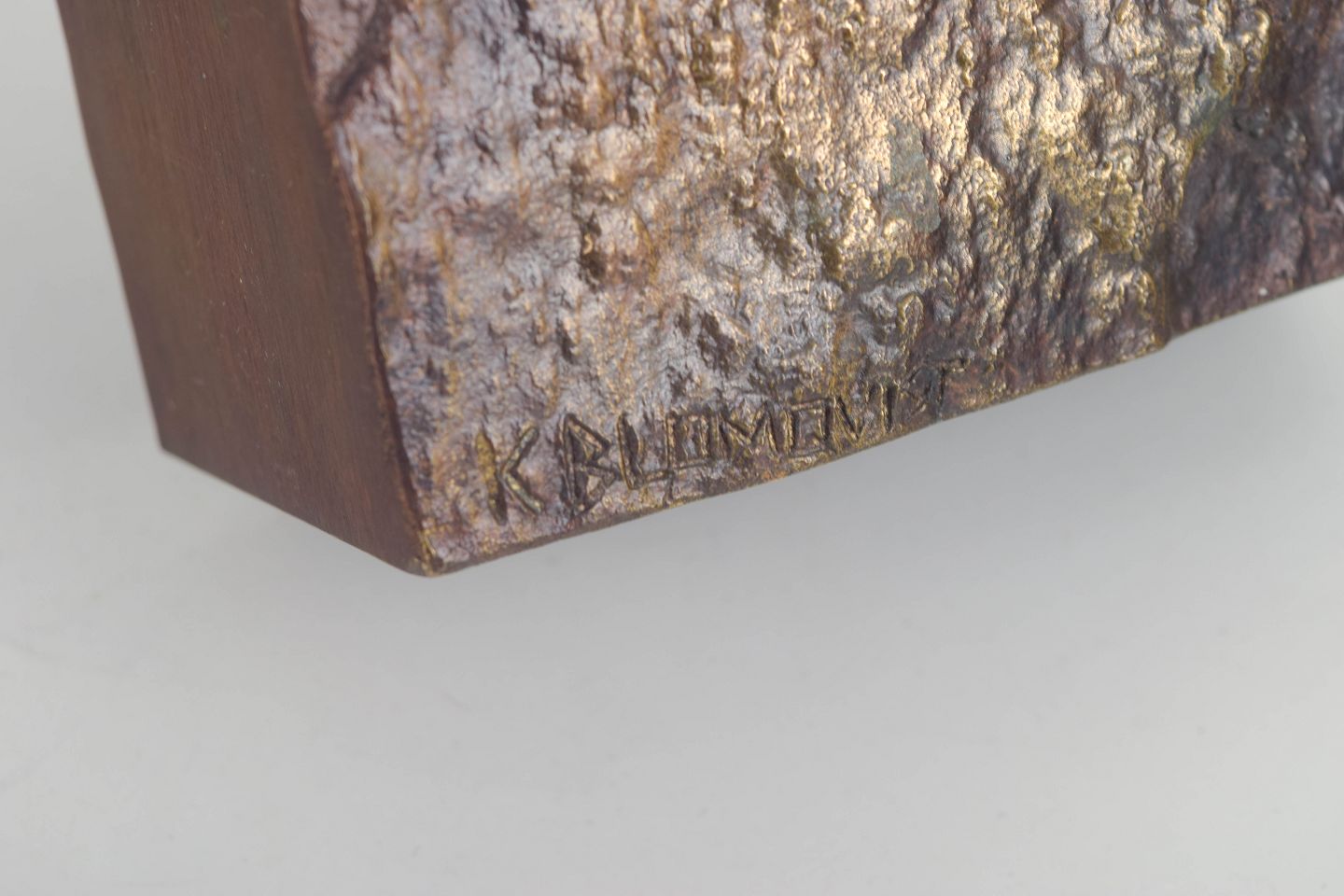 Rektangulær bronzeskulpturel vase med markant, rå strukturoverflade og plane sider, der skaber en kontrast mellem organisk relief og stram geometri. Et karakteristisk eksempel på finsk 1970’er-metalhåndværk med tydelig skulpturel tyngde.