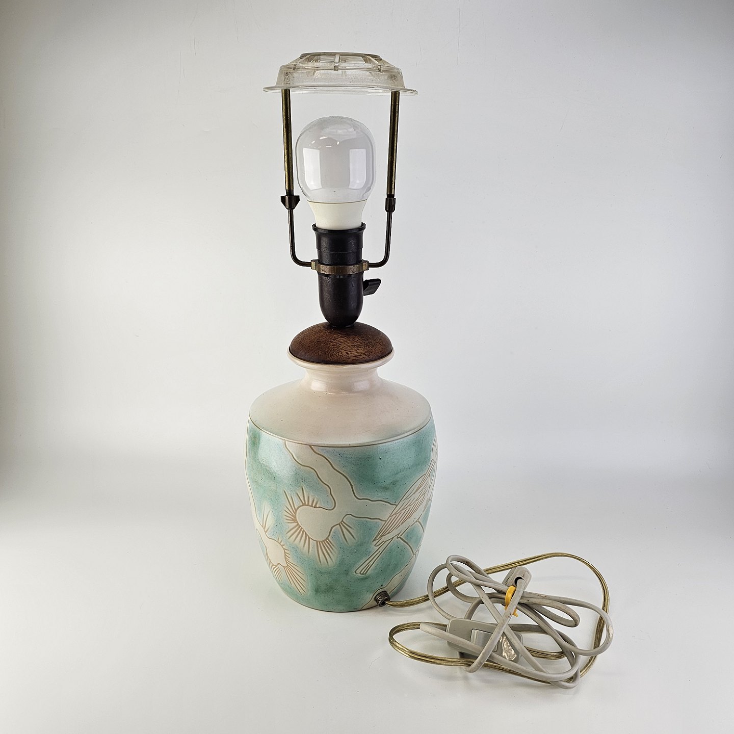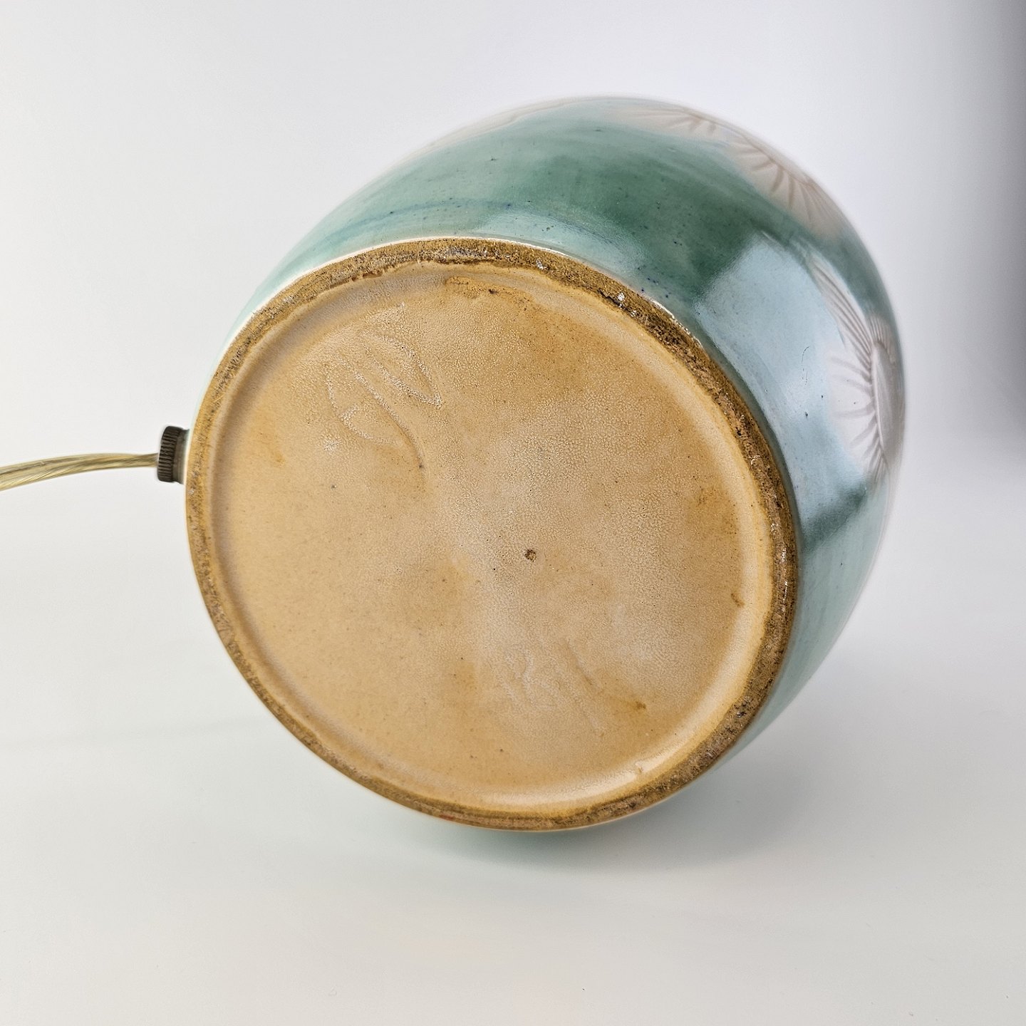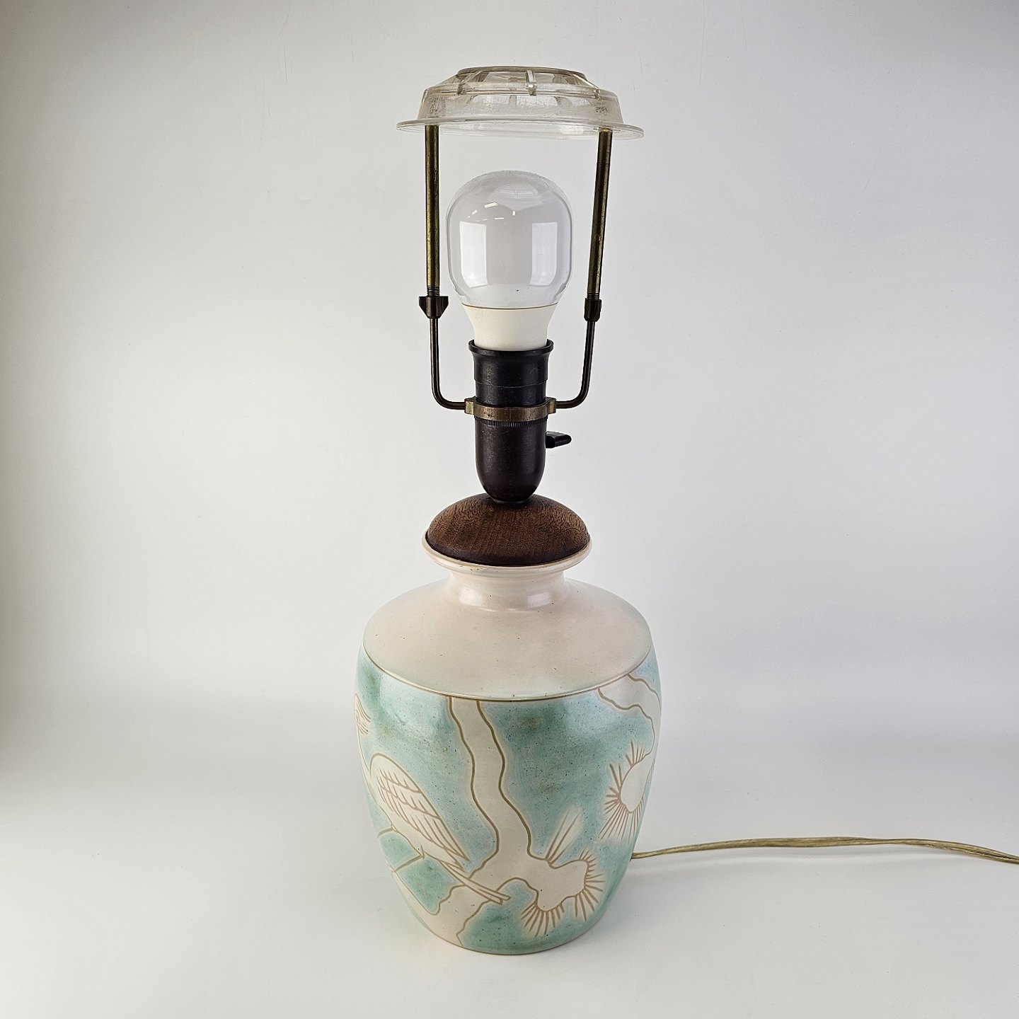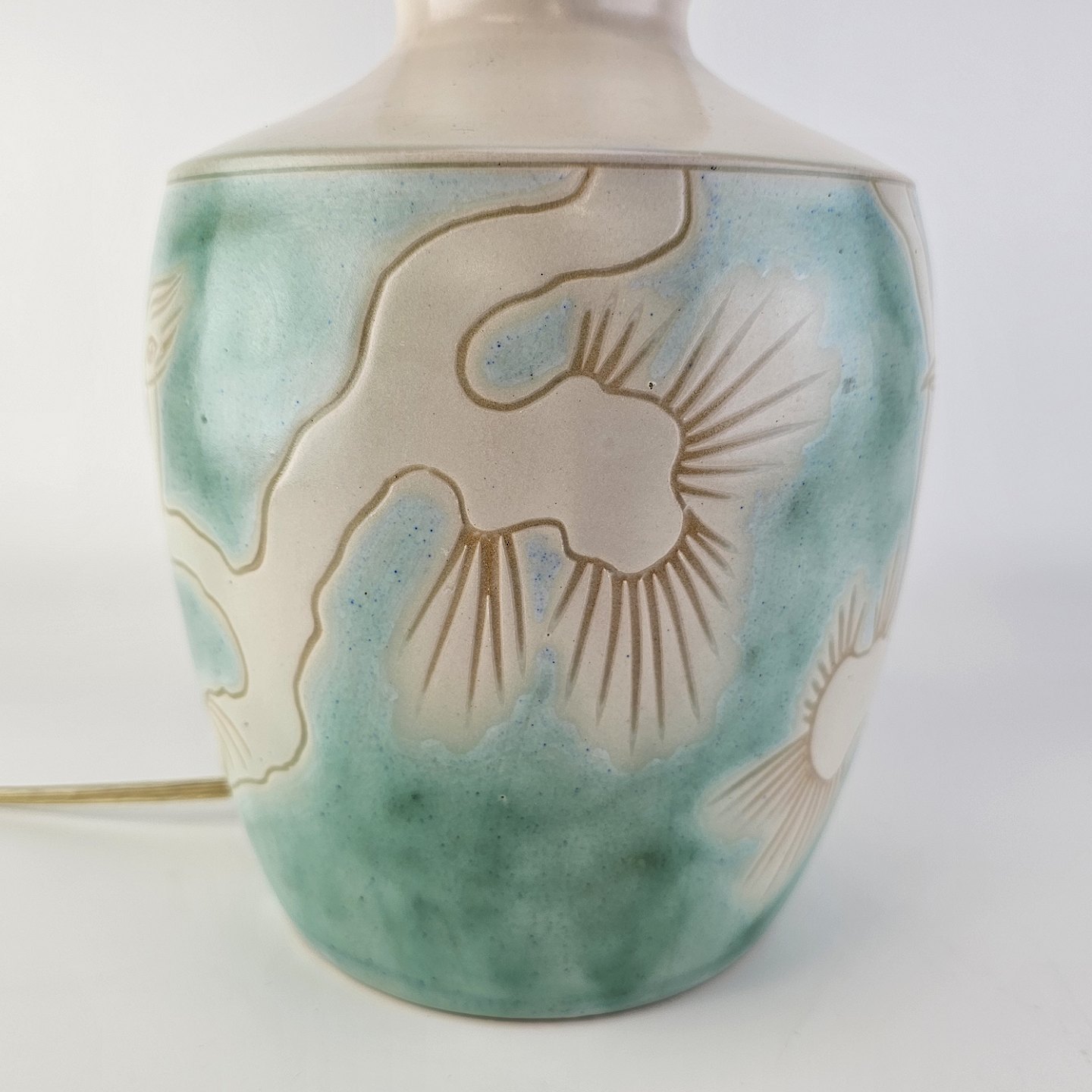 Bordlampe i hvid keramik med dekoration i blå og sort fatning