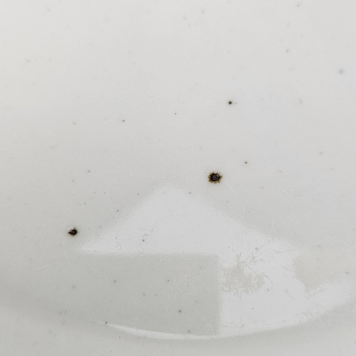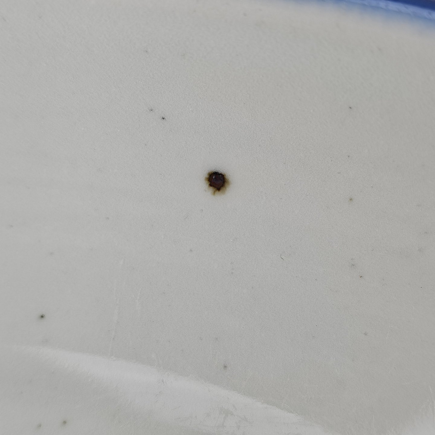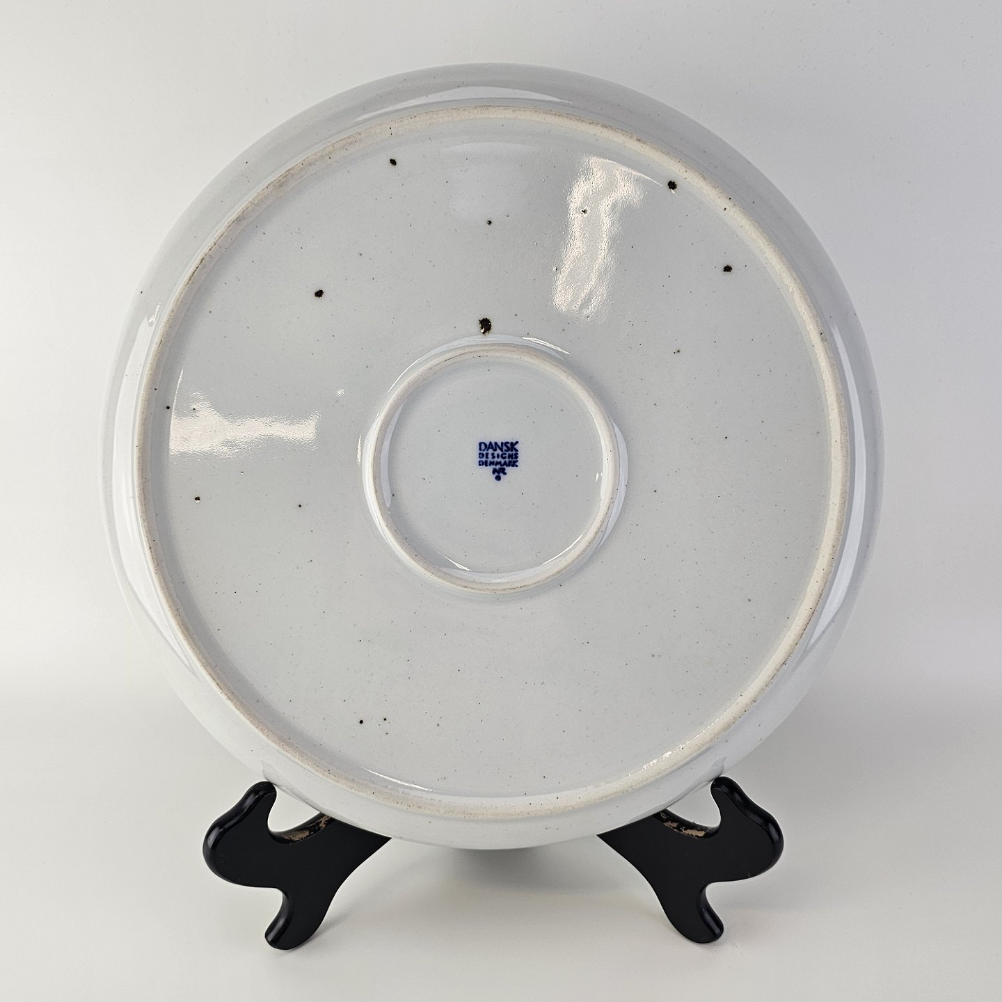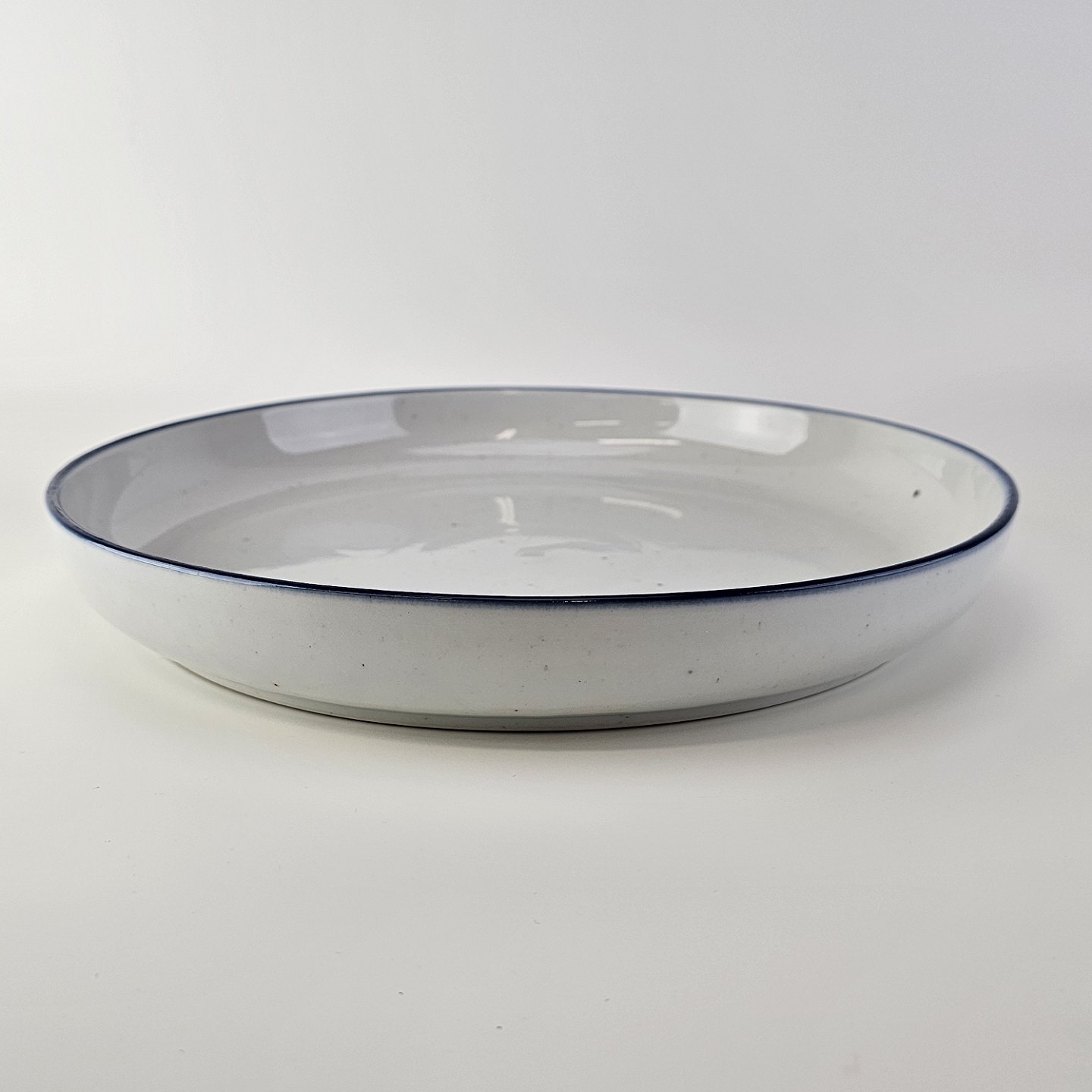 Rundt fad i stentøj med blå kant, jernpletter og hvid glasur