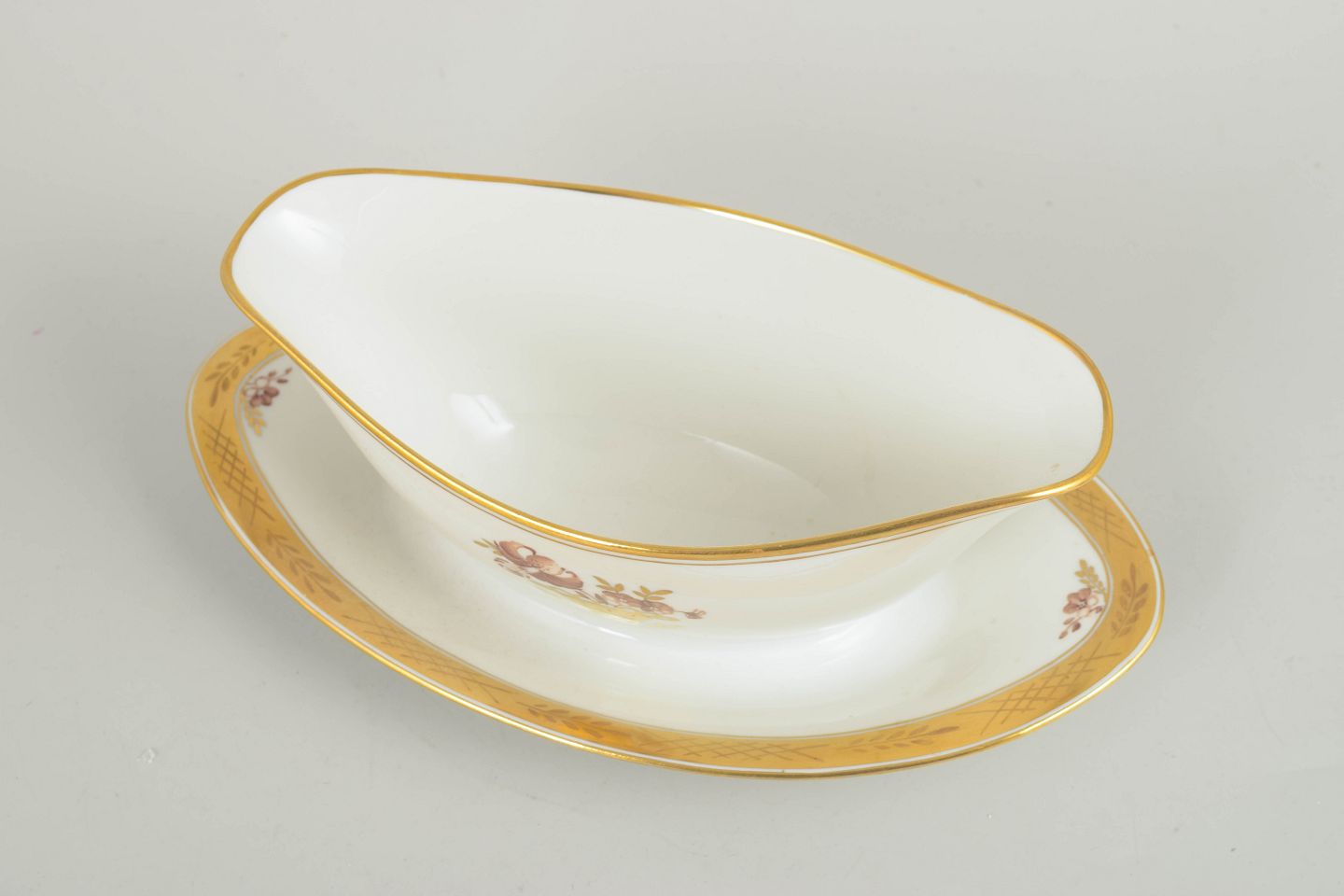 Elegant saucekande i porcelæn fra Royal Copenhagens “Guldkurv”-serie, model 595/9344. Udført med fastmonteret fad, forgyldt kant og det klassiske håndmalede blomsterkurvmotiv.