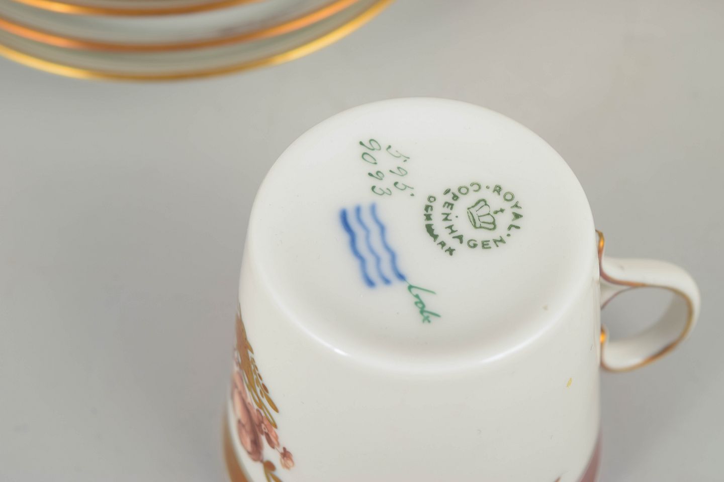 Smukt sæt bestående af fem mokkakopper med tilhørende underkopper fra Royal Copenhagens “Guldkurv”-serie, model 595/9093. Elegant udført i porcelæn med forgyldte kanter og håndmalede blomsterdekorationer.